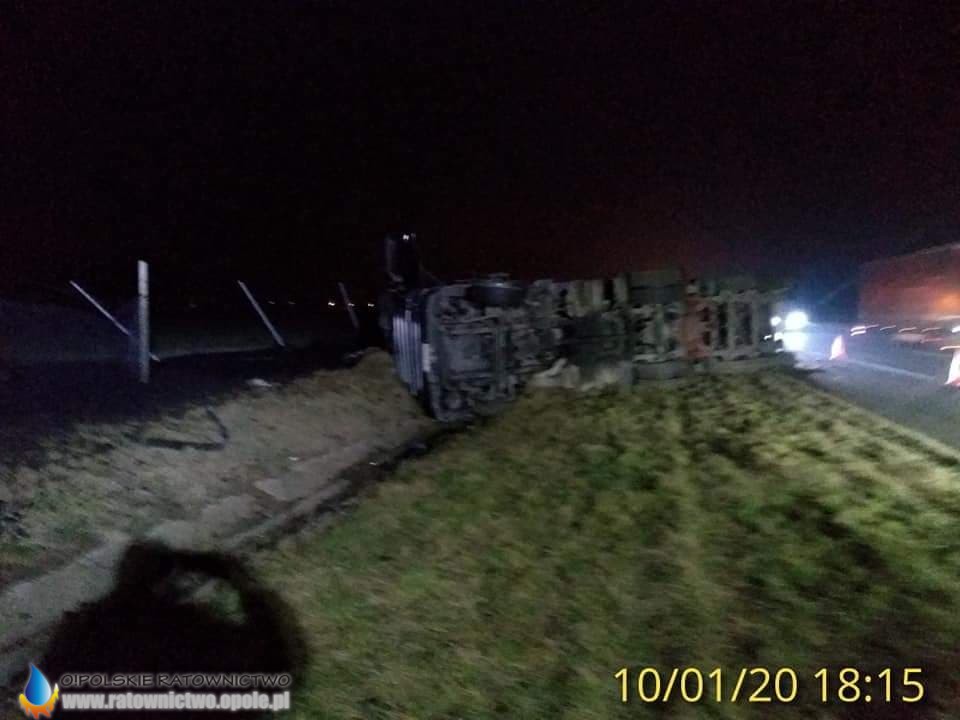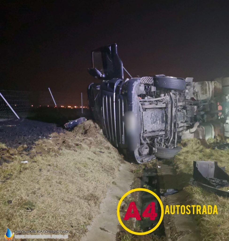 Kierowca ciężarowej scanii wraz z naczepą najprawdopodobniej zasnął za kierownicą, zjechał z jezdni i doprowadził do przewrócenia zestawu na pasie zieleni. Ładunek – węgiel wysypał się na trawę.
