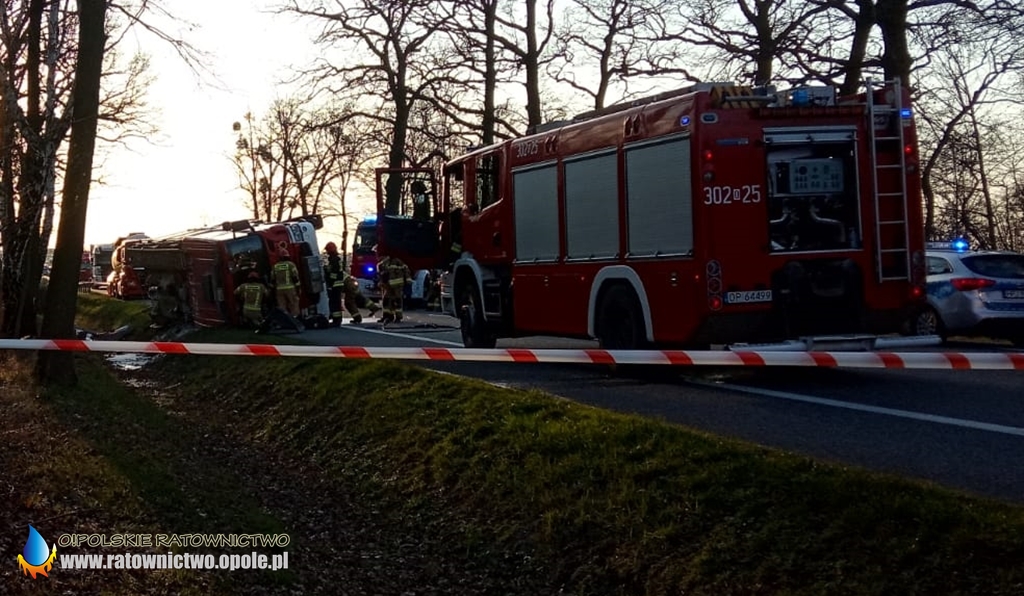 W trakcie dojazdu do zdarzenia z niewyjaśnionych na tą chwilę przyczyn kierowca samochodu strażackiego stracił panowanie nad pojazdem przewracając go na bok.
