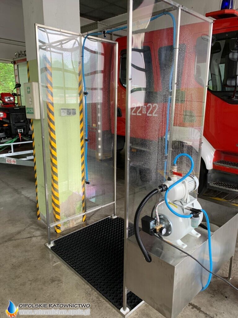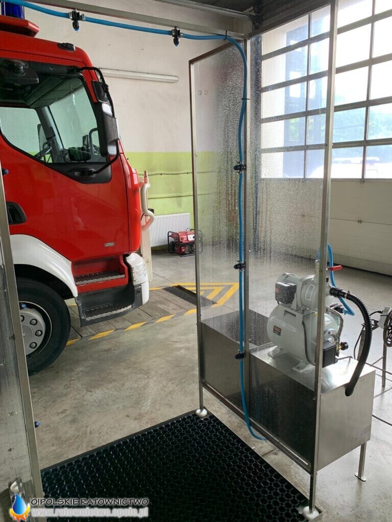 Instalacja wyposażona jest ponadto w hydrofor, który utrzymuje odpowiednie ciśnienia w przewodach rozprowadzających środek dezynfekcyjny. Metoda dezynfekcji pozwala personelowi medycznemu czuć się bezpiecznie po wyjściu z niej oraz swobodne i bezpieczne zdjęcie ubrania, które zostanie zdezynfekowane.