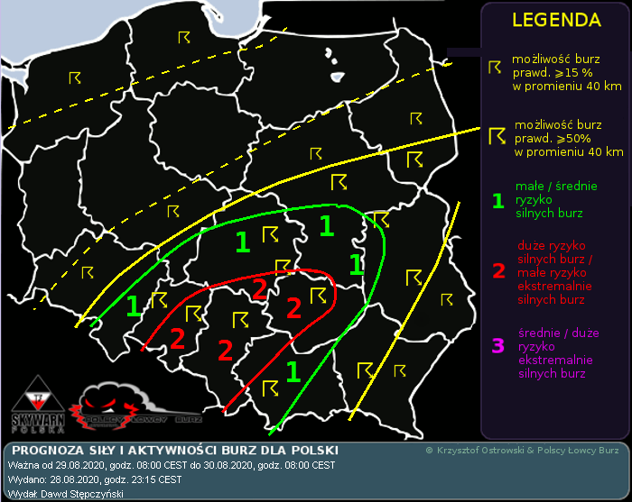 Główna aktywność burz w wyznaczonych obszarach przypadnie na godziny wieczorne i nocne (poza Polską Północną, gdzie słabe burze w formie pojedynczych komórek rozwijać się mają wcześniej). W obszarze objętym drugim stopniem zagrożenia ze względu na rozwój burz w późnych godzinach nie prognozuje się dużych wartości chwiejności termodynamicznej (MUCAPE do 500 j/kg). Jednakże przewidywane są umiarkowane/silne uskoki wiatru przekraczające 20 m/s (SHEAR z warstwy 0-6 km). Warto zwrócić uwagę na oczekiwane wysokie wartości skrętności wiatru, które mogą osiągać nawet 350 m2/s2 (SRH z warstwy 0-3 km). Burze mogą nieść za sobą przede wszystkim silne porywy wiatru, punktowo przekraczające 100 km/h oraz nawalne opady deszczu, których suma może osiągnąć 30-40 mm. Lokalnie nie wykluczamy gradu, którego średnica może osiągnąć 3-4 cm. W godzinach wieczornych i nocnych grad nie powinien być głównym zagrożeniem ze strony burz. W przypadku uformowania się izolowanej superkomórki burzowej nie wyklucza się także trąby powietrznej (niewielkie ryzyko).