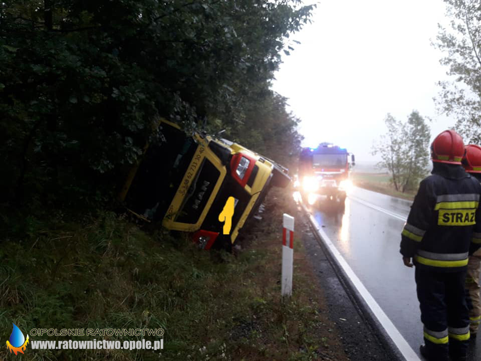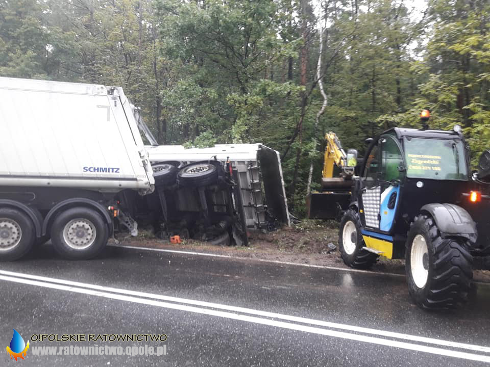 Kierujący ciągnikiem siodłowym marki MAN z naczepą z ładunkiem węgla zjechał do rowu i przewrócił się na bok. Z naczepy wysypał się ładunek. Na szczęście w zdarzeniu nikt nie został poszkodowany.