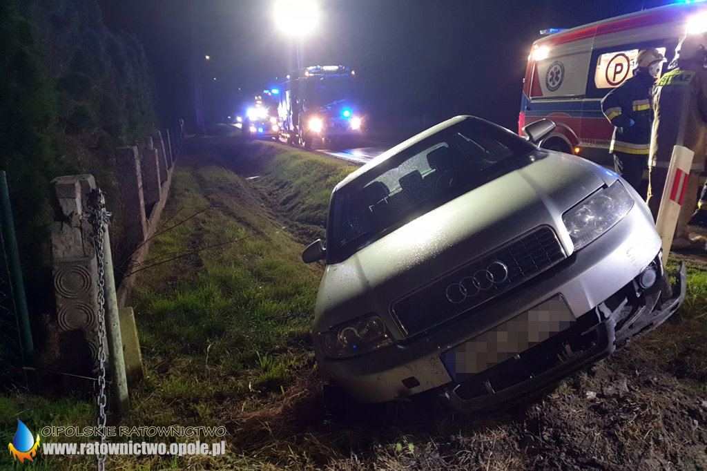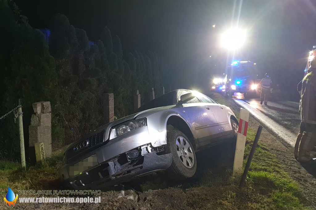 Po dojeździe na miejsce pierwszych zastępów okazało się, że kierujący audi jadąc od strony ronda zjechał do rowu i uderzył w betonowy przepust.