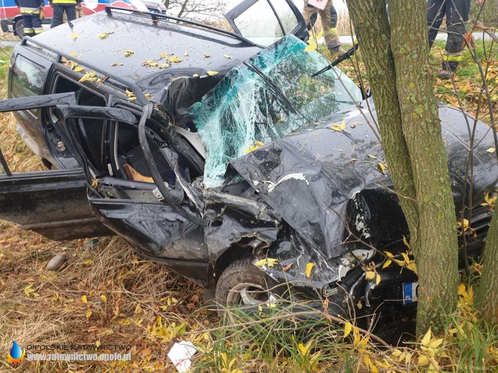 Po dojeździe na miejsce zdarzenia pierwszych zastępów straży pożarnej i rozpoznaniu okazało się, że kierujący samochodem osobowym marki Volkswagen zjechał z jezdni i uderzył w przydrożne drzewo.