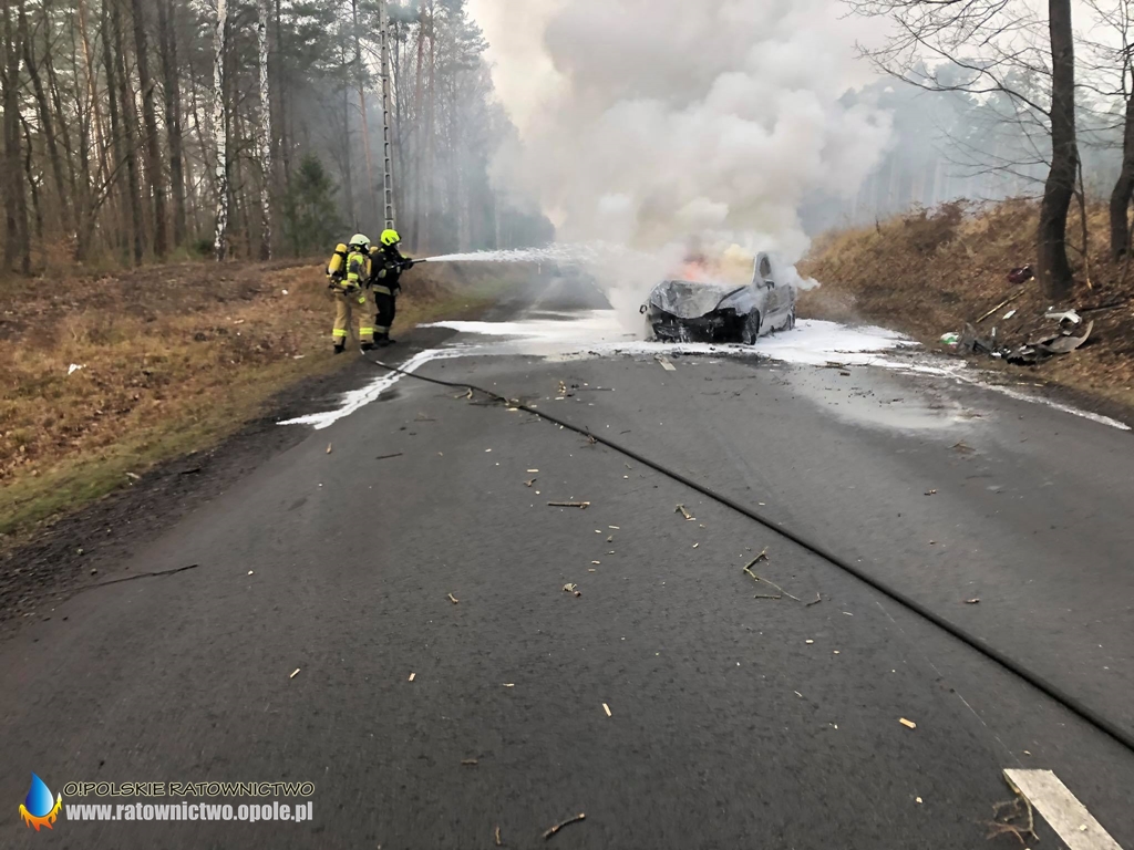 Po dojeździe na miejsce pierwszego zastępu okazało się, że, kierujący samochodem osobowym marki Fiat Stilo stracił panowanie nad pojazdem, uderzył w drzewo, po czym jego samochód stanął w płomieniach.