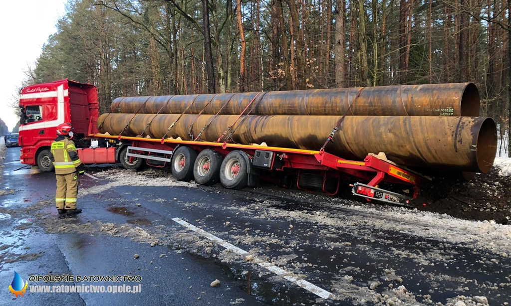 Kierujący samochodem ciężarowym marki Scania podczas mijania z innym samochodem ciężarowym złapał naczepą pobocze, następnie stając w poprzek drogi.