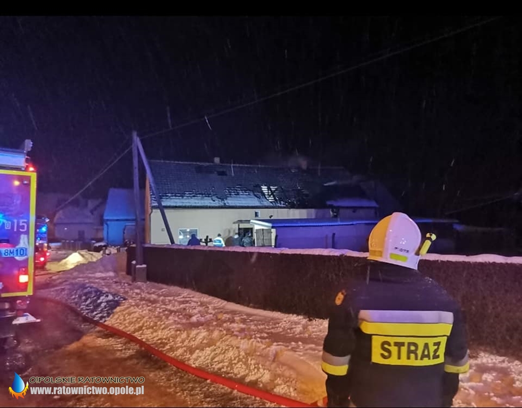 – Mieszkańcy, dwie osoby, opuścili budynek przed przybyciem straży, nie wymagali czynności medycznych. Podano 2 prądy gaśnicze wody w natarciu na palący się dach budynku mieszkalnego oraz jeden do wewnątrz, na część strychową. Ponadto częściowo rozebrano dach w celu dotarcia do źródła ognia. Po dogaszeniu pożaru uszkodzony dach zabezpieczono plandeką – informuje kpt. Damian Skowroński ze Stanowiska Kierowania Opolskiego Komendanta Wojewódzkiego PSP.