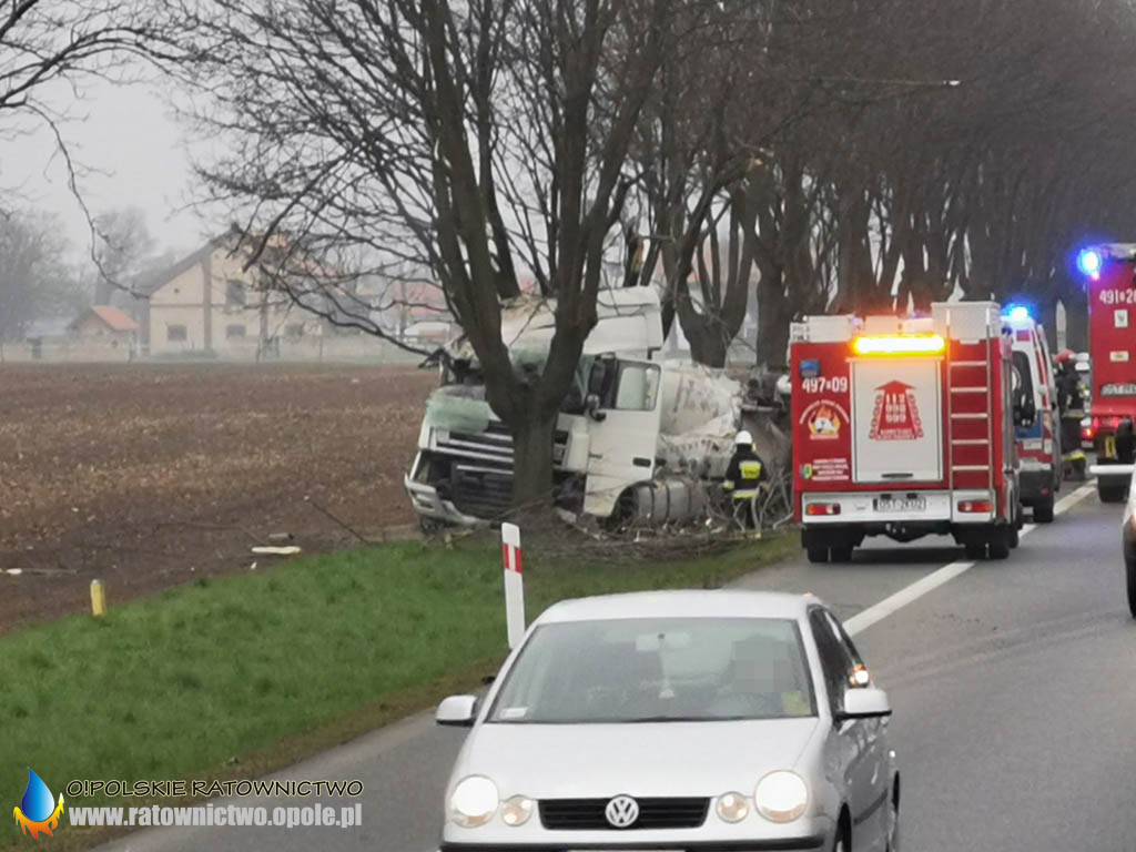 Kierujący cieżarówką z naczepą z cementem zjechał na prawą stronę drogi i uderzył w drzewo.