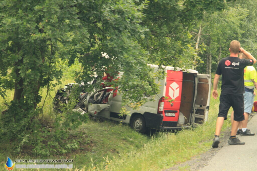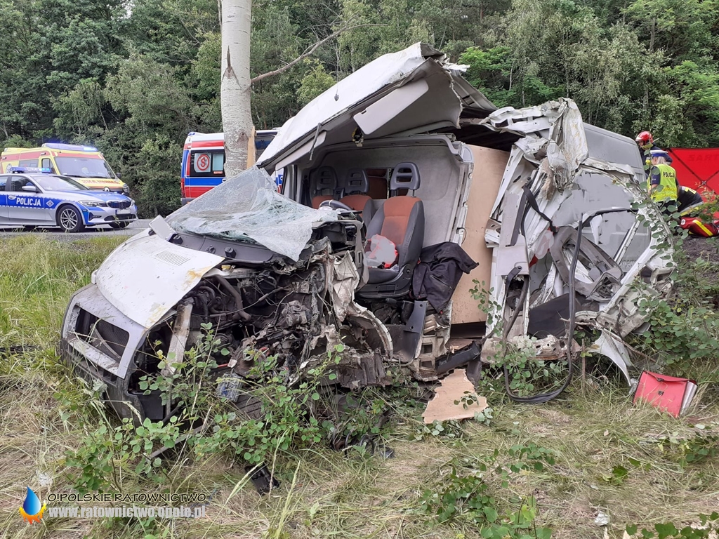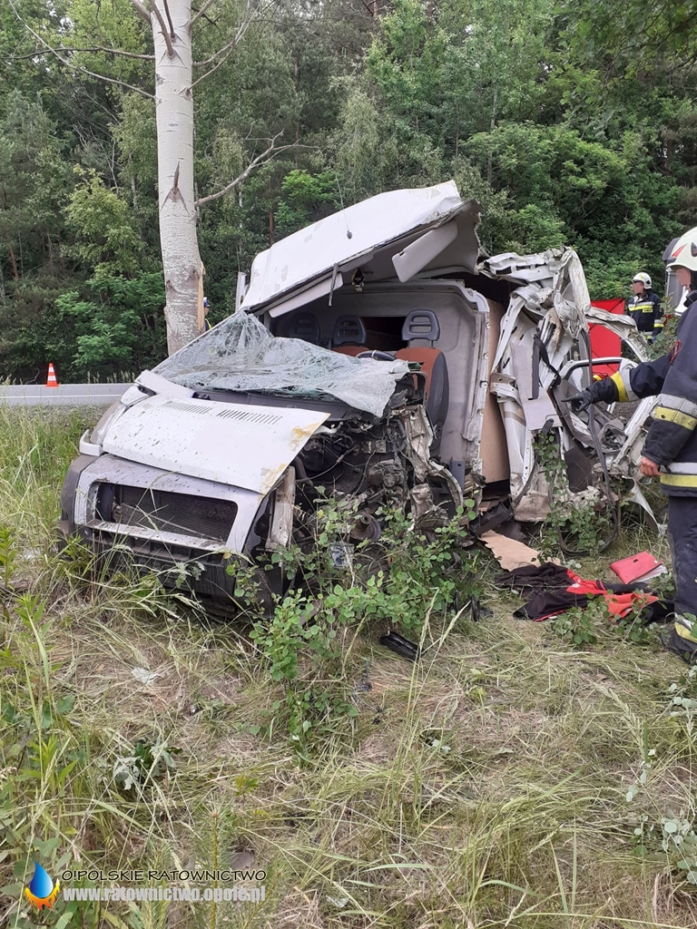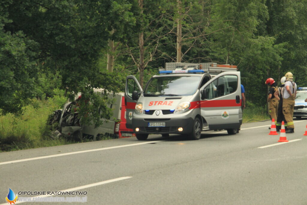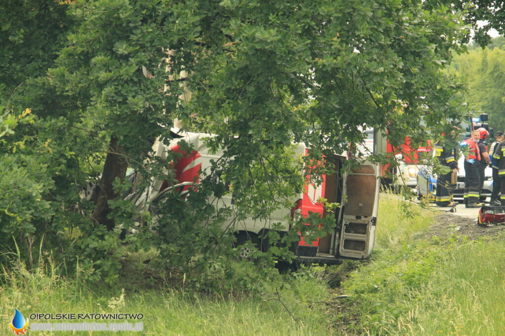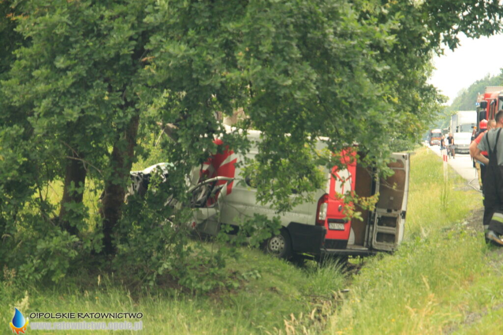 Groźny wypadek na DK45 na obwodnicy Osowca – kierujący busem uderzył w drzewo
