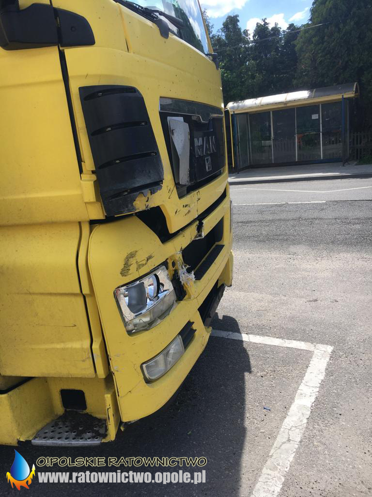 Kierujący ciągnikiem siodłowym MAN uderzył w niewielką wywrotkę KIA z węglem. Wywrotka znajdowała się na rondzie i została uderzona w bok. Ładunek wysypał sie na drogę powodując utrudnienia w ruchu.