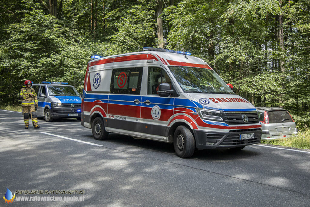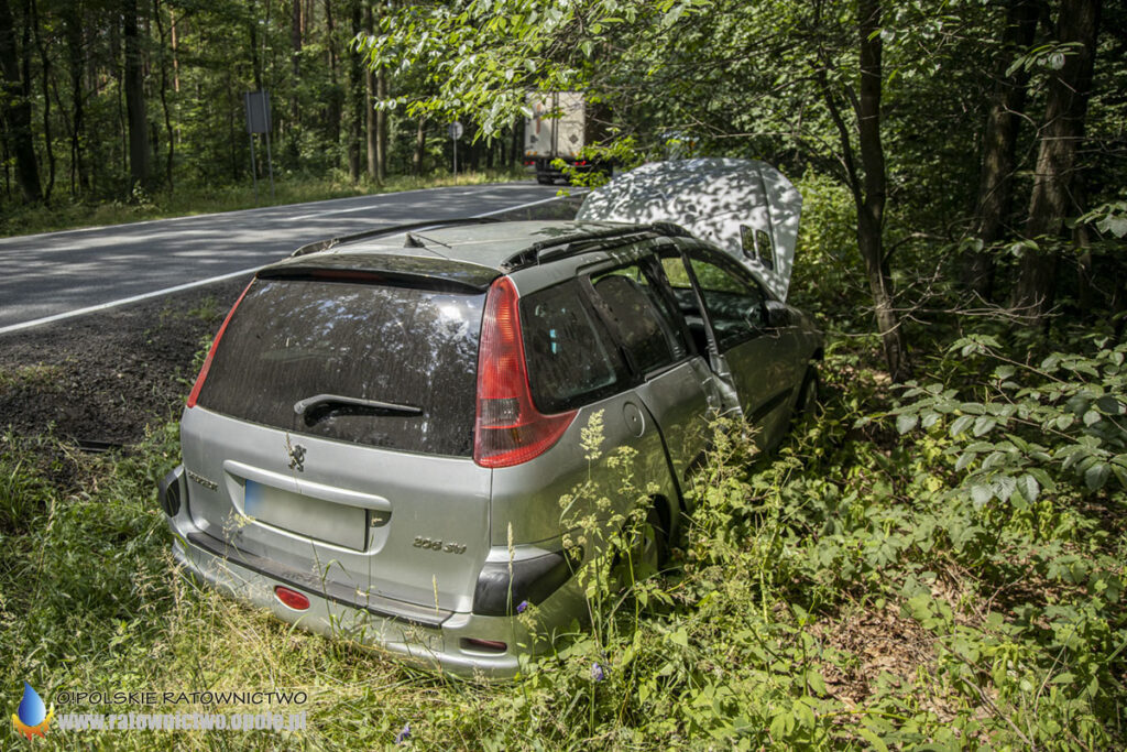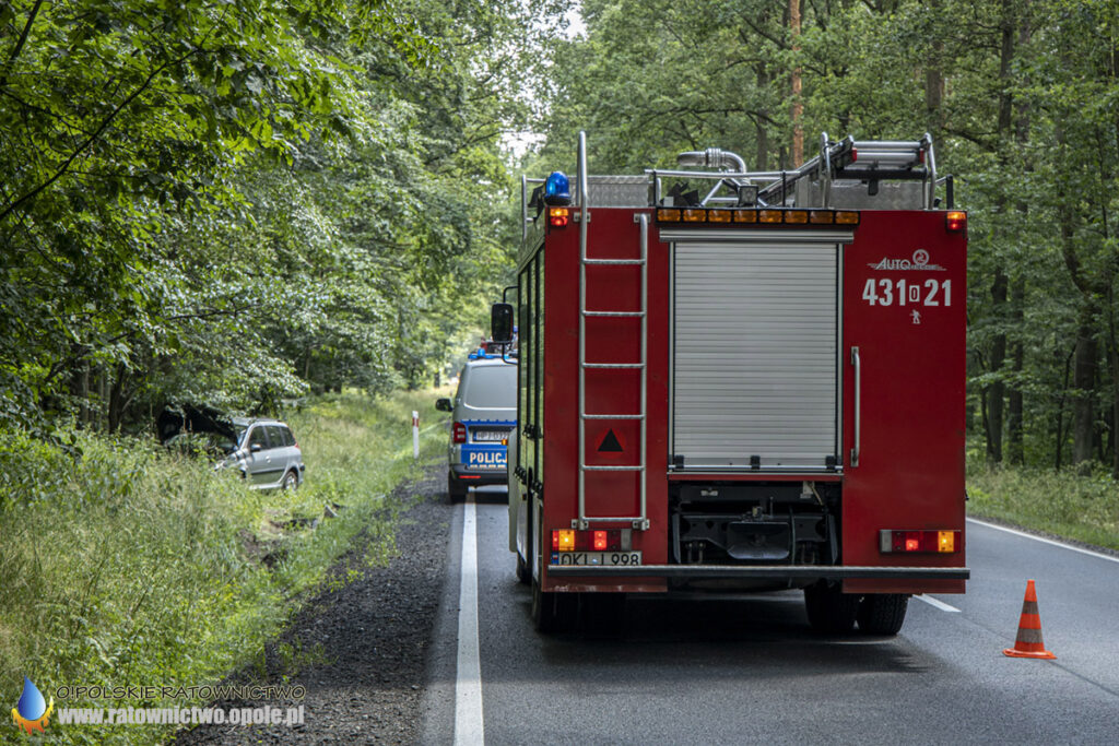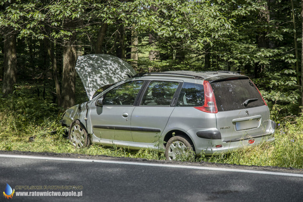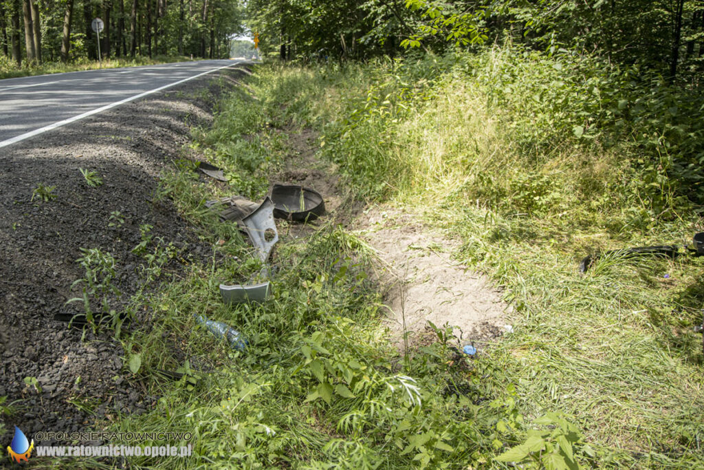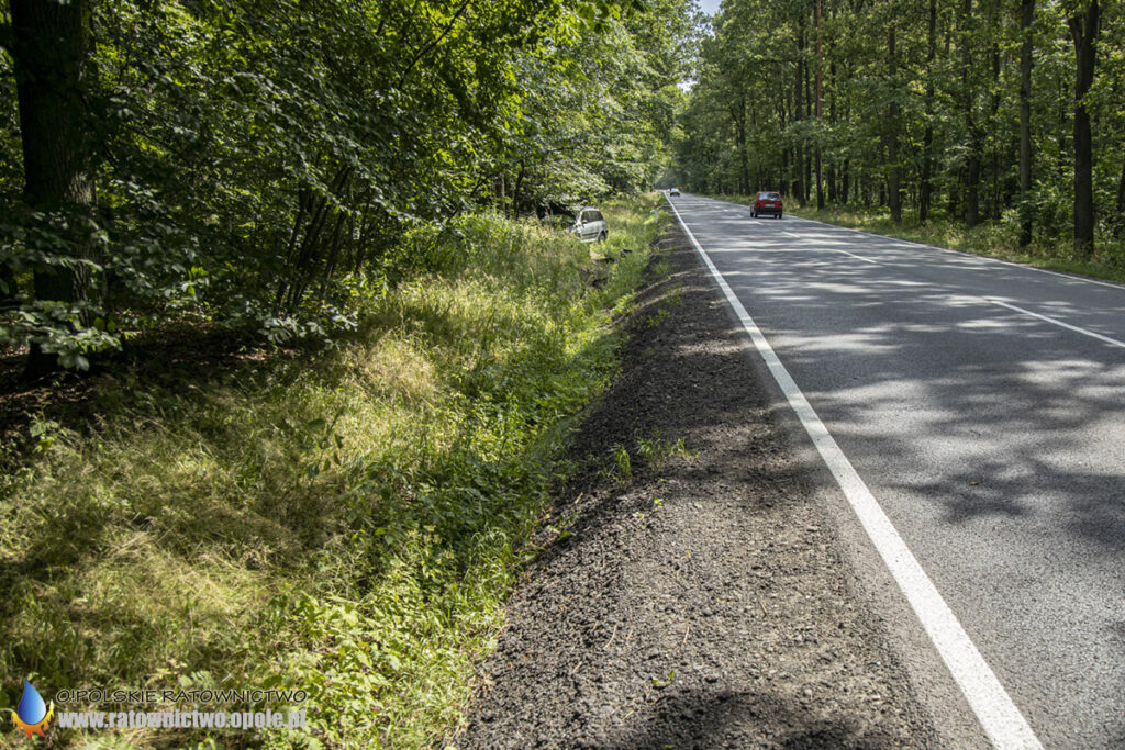 Kierujący samochodem osobowym jadąc od strony Kluczborka w nieustalonych przyczyn zjechał na lewą stronę drogi i po wjechaniu do rowu dachował. Auto po uderzeniu w skarpę obróciło się w kierunku przeciwnym do jazdy.