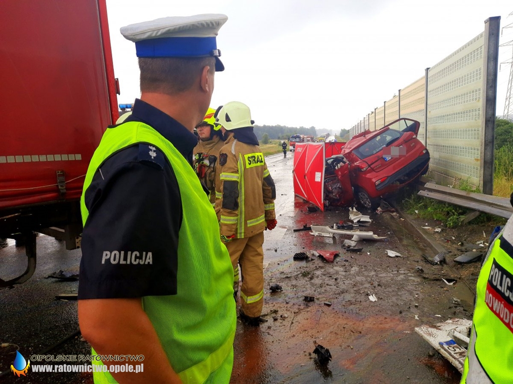 Wczoraj w godzinach popołudniowych dyżurny komendy miejskiej otrzymał informację o wypadku na obwodnicy Opola. Jak ustalili pracujący na miejscu policjanci, kierująca renault z nieustalonej dotąd przyczyny, nagle zjechała na przeciwległy pas. 42-latka uderzyła w koło jadącej z przeciwnego kierunku ciężarówki. Ta złamała się i stanęła w poprzek drogi. I to właśnie w ,,ciężarowego kolosa” wjechała prawidłowo jadąca hyundaiem 25-latka. Kobieta poniosła śmierć na miejscu. Pasażerka z którą podróżowała i kierująca renault z obrażeniami trafiły do szpitala.