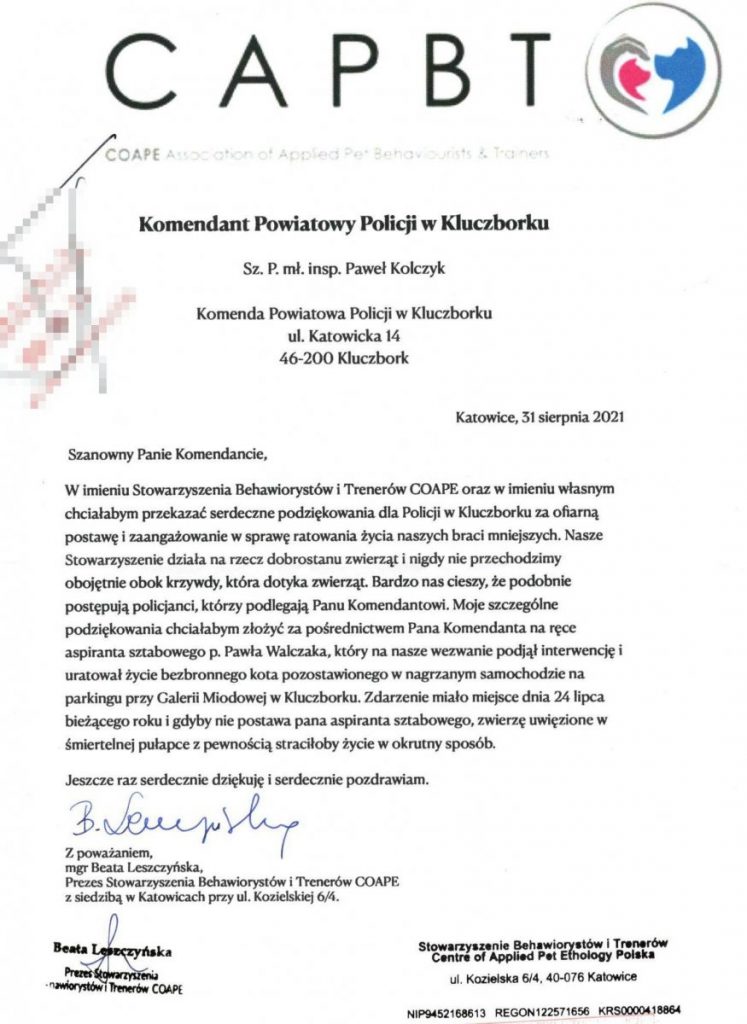„(…) chciałabym przekazać serdeczne podziękowanie dla Policji w Kluczborku za ofiarną postawę i zaangażowanie w sprawę ratowania życia naszych braci mniejszych” – takimi słowami zgłaszająca podziękowała dzielnicowemu za uratowanie kota, który znajdował się w nagrzanym samochodzie. Policjant wydostał zwierze z samochodu nie powodując jego uszkodzenia. W tym czasie właściciel kota przebywał na zakupach.