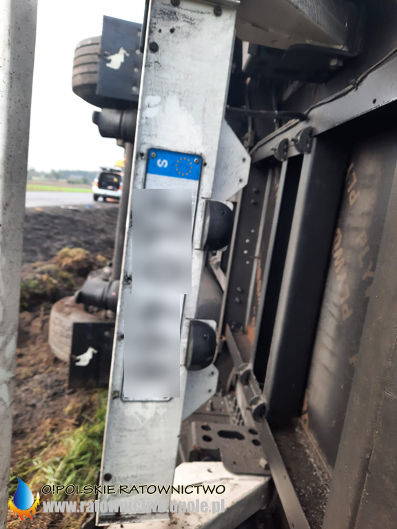 W wyniku przewrócenia się do rowu uszkodzeniu uległ zbiornik z olejem napędowym. Strażacy zabezpieczyli miejsce zdarzenia i odłączyli zasilanie w samochodzie. Olej z uszkodzonego zbiornika został przepompowany do zbiornika zastępczego.