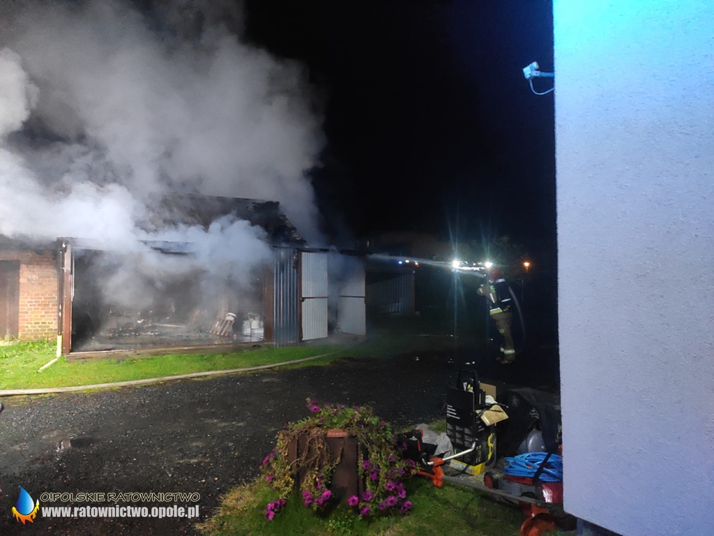 – Po dojeździe na miejsce zastano rozwinięty pożar budynku gospodarczego wraz z przyległymi garażami, w pobliżu zagrożone budynki wielorodzinne oraz pozostałe pomieszczenia w budynku gospodarczym. Działania jednostek ochrony przeciwpożarowej polegały na podaniu 4 prądów wody, ewakuacji samochodu osobowego z garażu, lokalizacji zarzewi ognia oraz dogaszeniu pogorzeliska. W wyniku pożaru nikt nie ucierpiał – informuje mł. bryg. Mariusz Strzelczak oficer prasowy Komendanta Powiatowego PSP w Oleśnie.