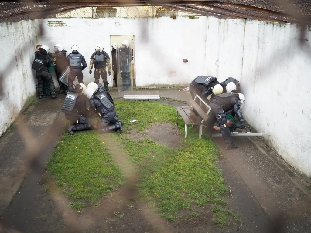 Pierwsza część ćwiczeń to bunt grupy osadzonych na placu spacerowym. Odmówili oni wykonania poleceń, nie reagowali na próby nakłonienia ich do zaniechania oporu. W efekcie błyskawicznego działania funkcjonariuszy strzeleckiej „dwójki” osadzeni zostali obezwładnieni.