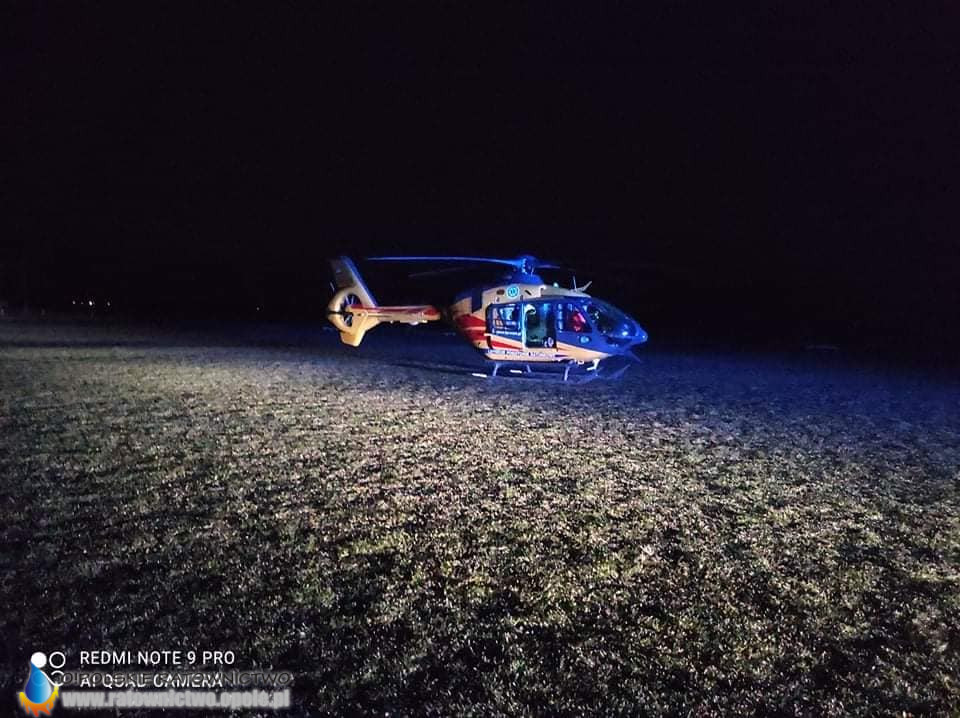 Przy miejscu pożaru lądował śmigłowiec Lotniczego Pogotowia Ratunkowego – Ratownik 13, który przetransportował poparzonego mężczyznę do specjalistycznej placówki medycznej w kraju.