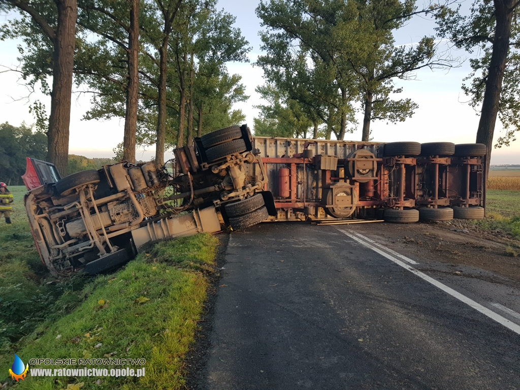 Na wysokości miejscowości Królowe kierujący samochodem ciężarowym z naczepą stracił panowanie nad pojazdem i przewrócił się na bok.