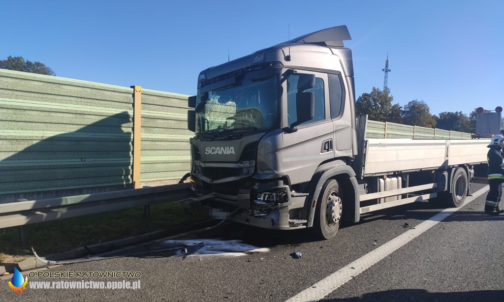 Na pasie w kierunku Wrocławia w wyniku niezachowania bezpiecznej odległości kierujący samochodem ciężarowym marki Scania uderzył w naczepę poprzedzającej go ciężarówki.