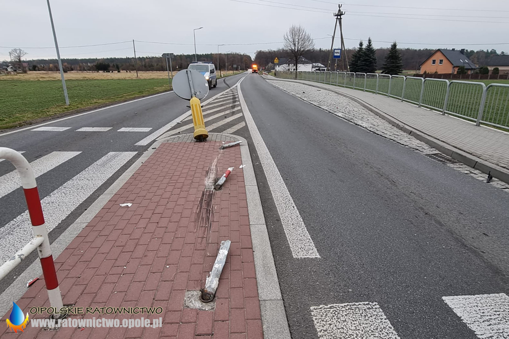 Kierujący citroenem jadąc od strony Opola na łuku drogi wjechał na wysepkę na przejściu dla pieszych, na której zniszczył barierki. Następnie zjechał na przeciwległy pas drogi i zakończył swoją podróż w rowie po drugiej stronie jezdni.