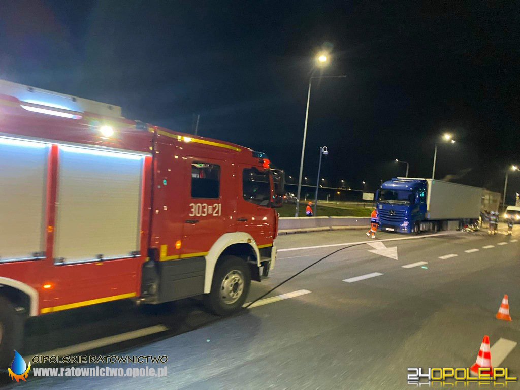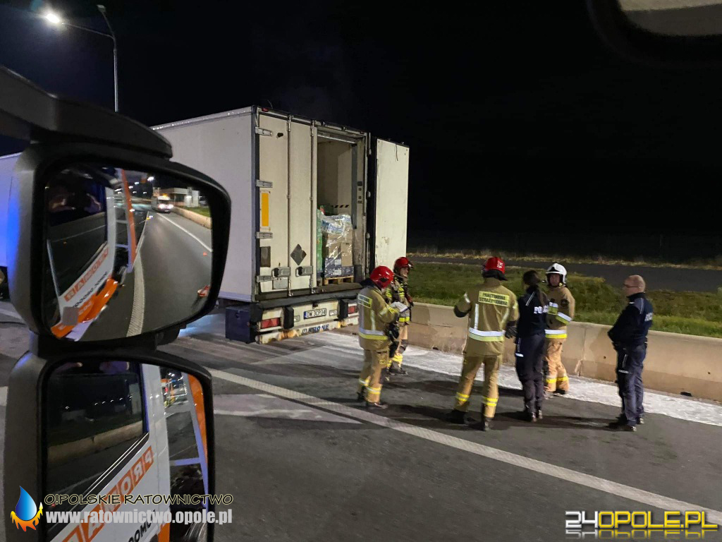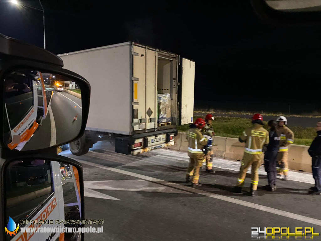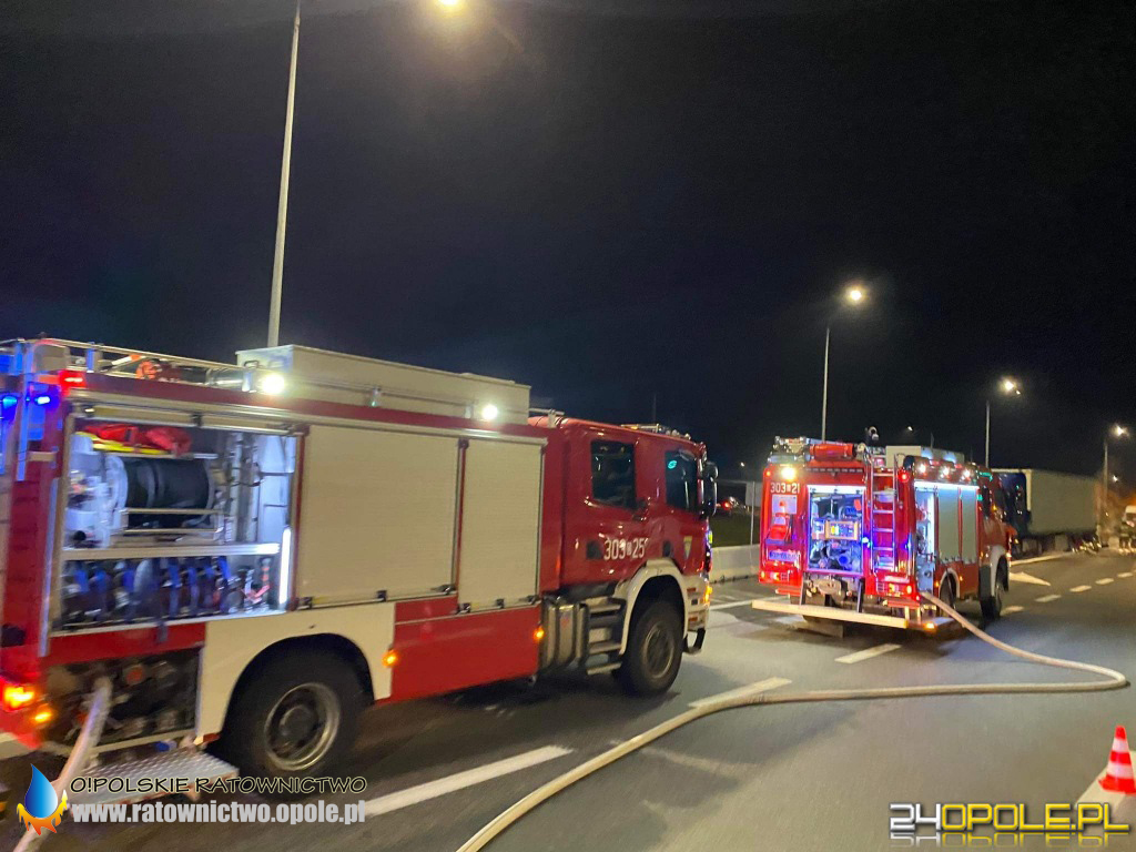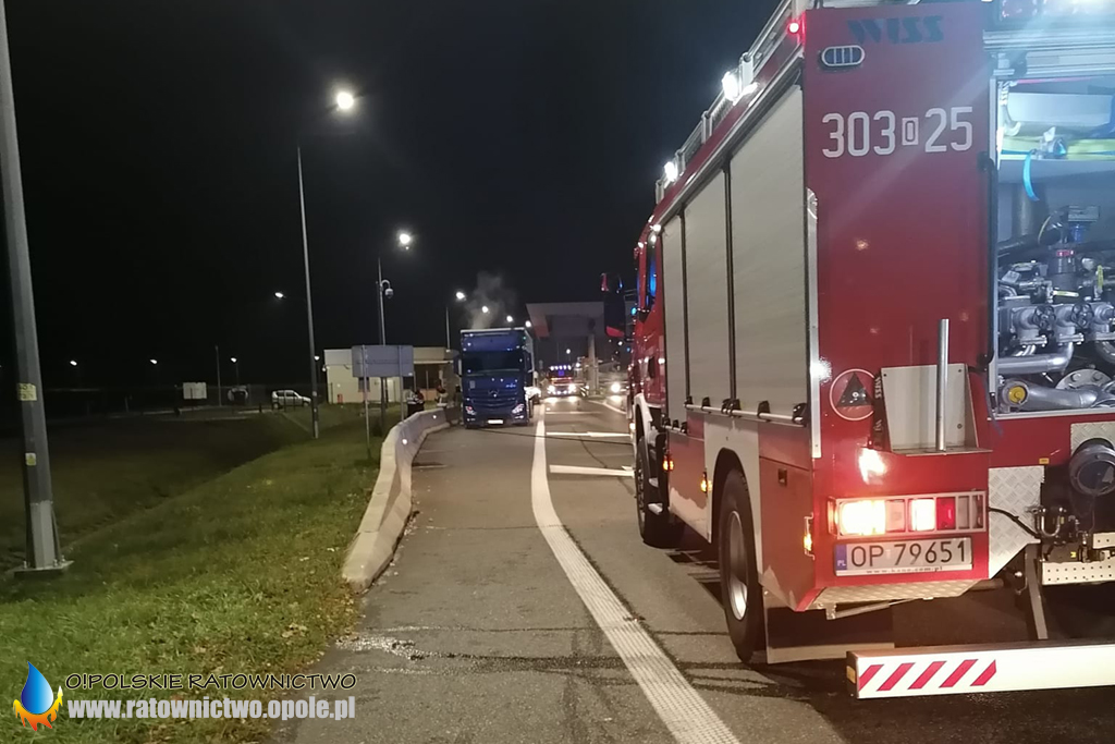 We wtorek 16 listopada kilka minut po godzinie 21 straż pożarna otrzymała zgłoszenie o pożarze w naczepie samochodu ciężarowego przy punkcie poboru opłat przy zjeździe z A4.