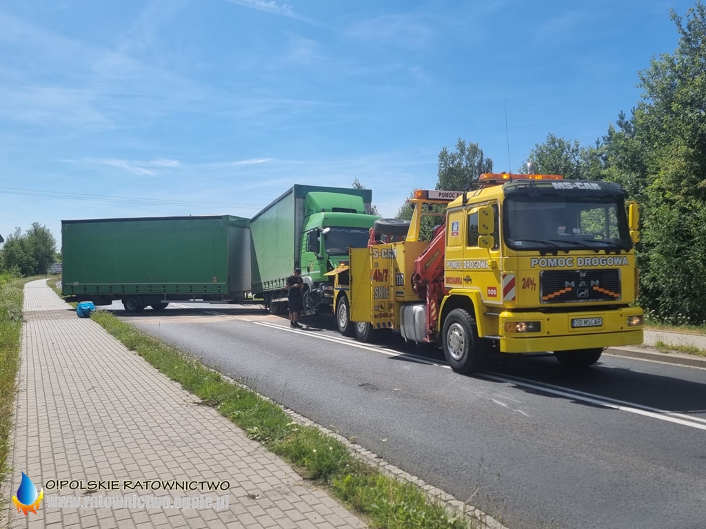Po dojeździe na miejsce służb potwierdzono zderzenie samochodu osobowego marki Skoda i ciężarowego marki MAN z przyczepą, który w wyniku zderzenia zablokował całkowicie drogę.