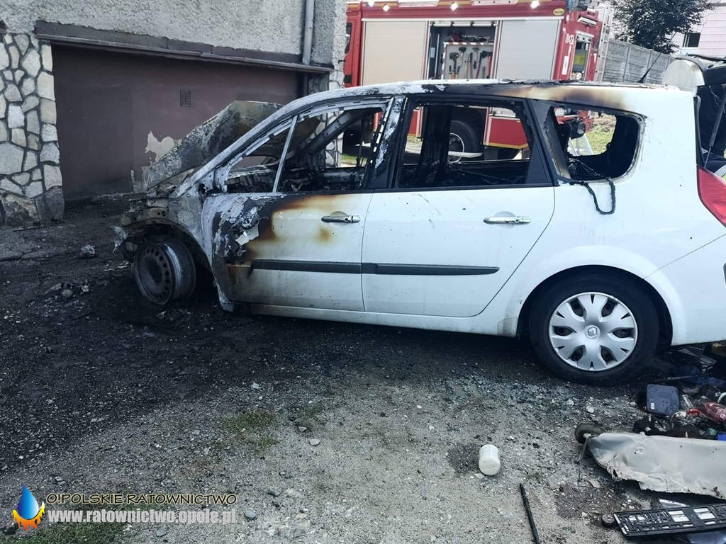 Po przybyciu na miejsce pierwszego zastępu zastano w pełni rozwinięty pożar samochodu osobowego. Niestety Renault Scenic spłonęło niemal doszczętnie.