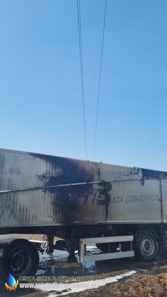W wyniku pożaru ciągnik siodłowy marki Mercedes spłonął doszczętnie, poważnemu uszkodzeniu uległa także naczepa typu wanna.