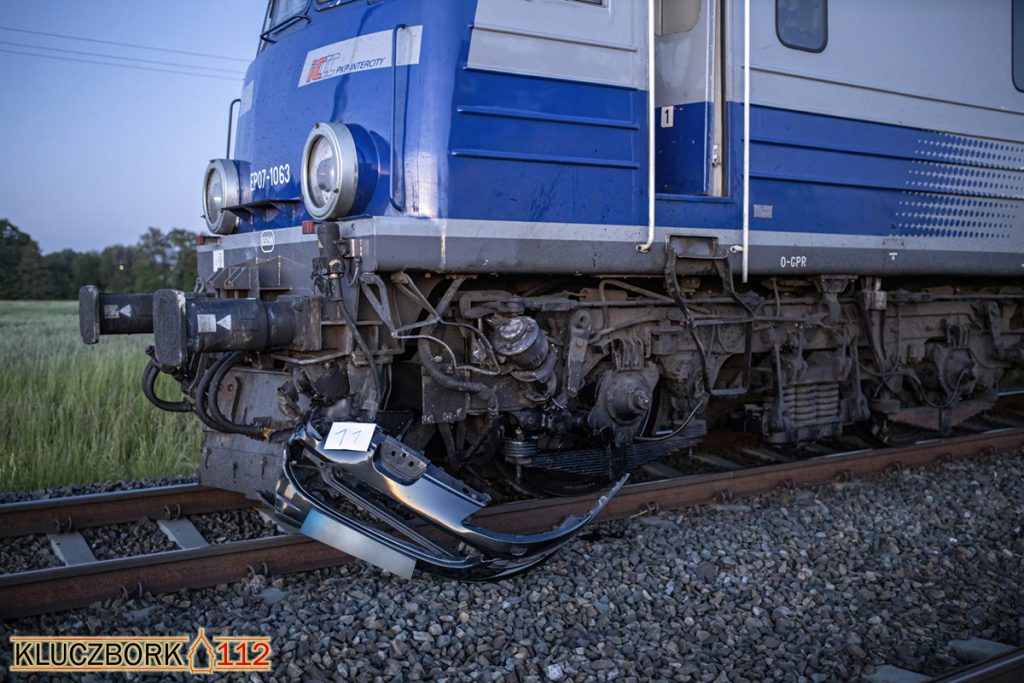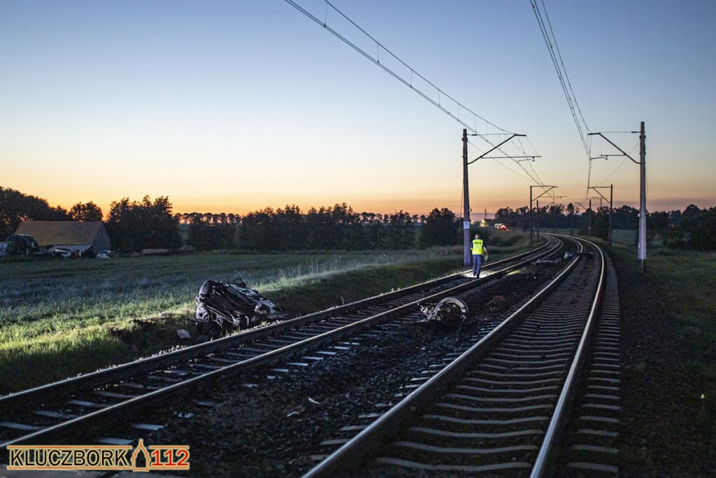 Samochód po zderzeniu z pociągiem znalazł się na dachu w rowie. Pociąg zatrzymał się po kilkuset metrach.