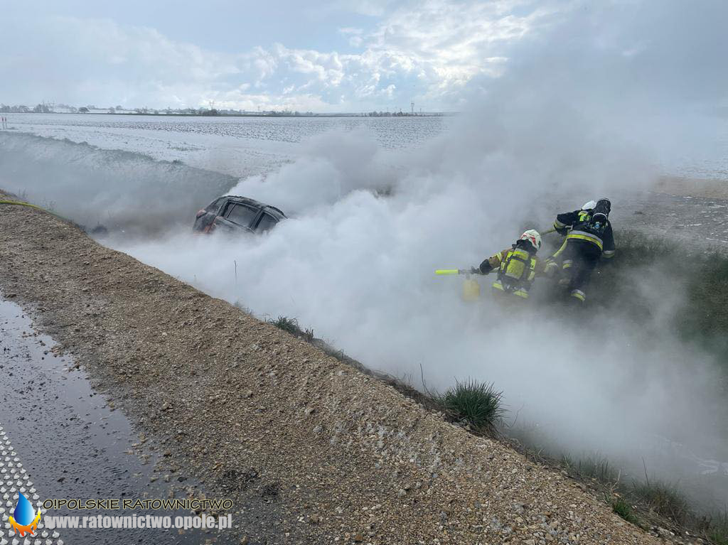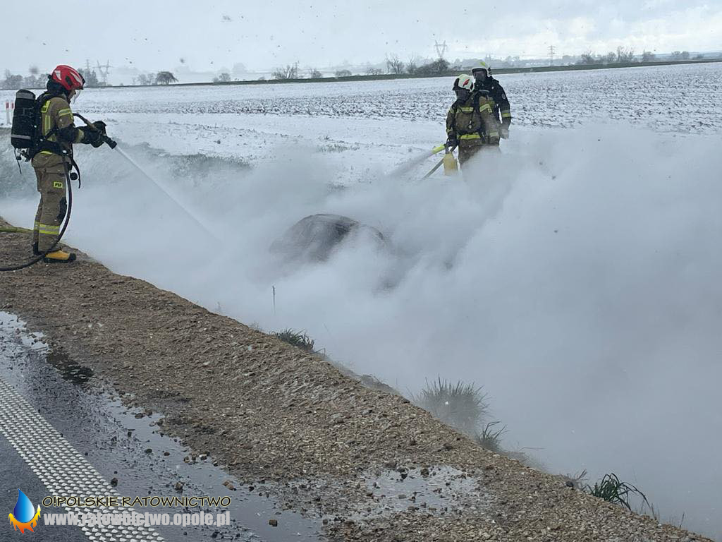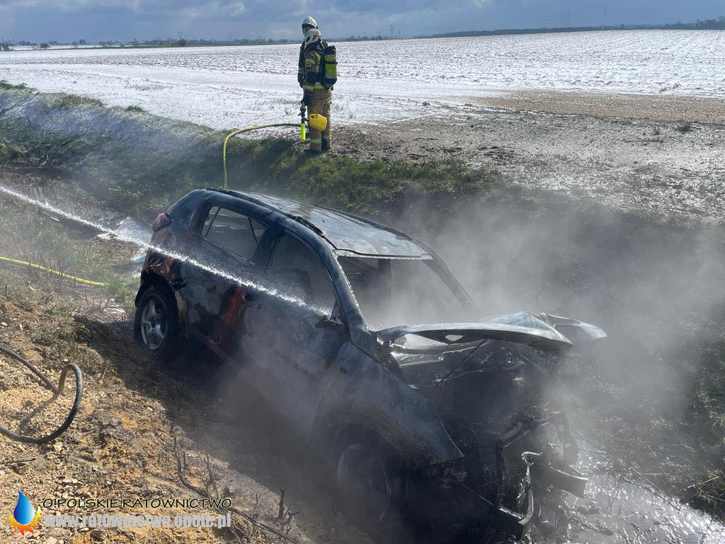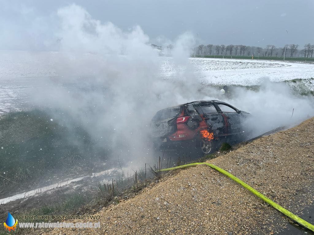 Przybyli na miejsce strażacy zastali objęty w całości ogniem samochód osobowy, który znajdował się w rowie. Mimo działań podjętych przez strażaków pojazd spłonął doszczętnie.