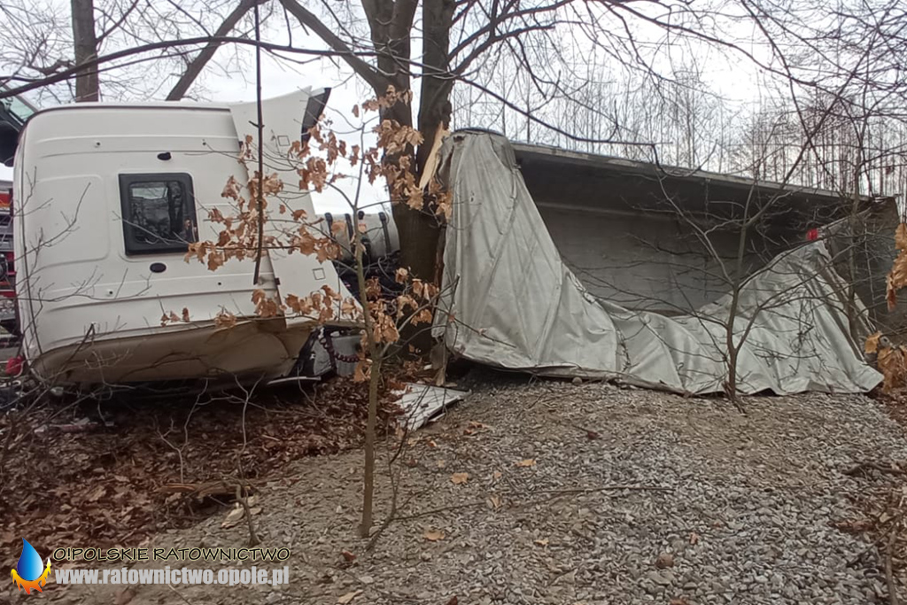 Kierujący samochodem Scania z naczepą z nieustalonej przyczyny zjechał na przeciwległy pasu ruchu i przewrócił się w rowie. Z naczepy wysypał się przewożony ładunek kruszywa.