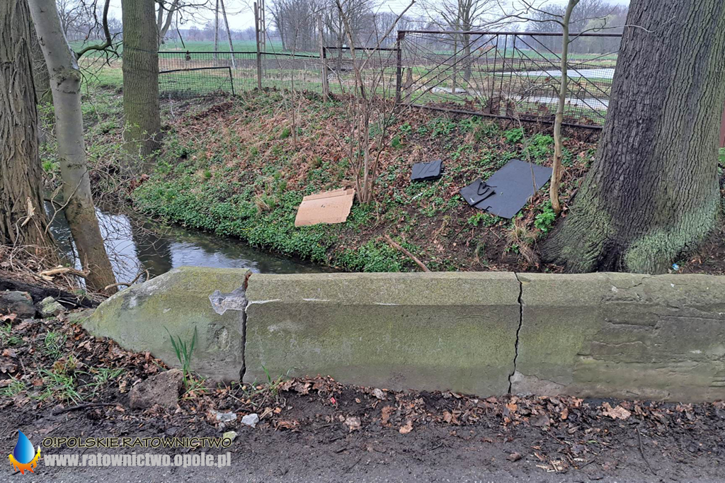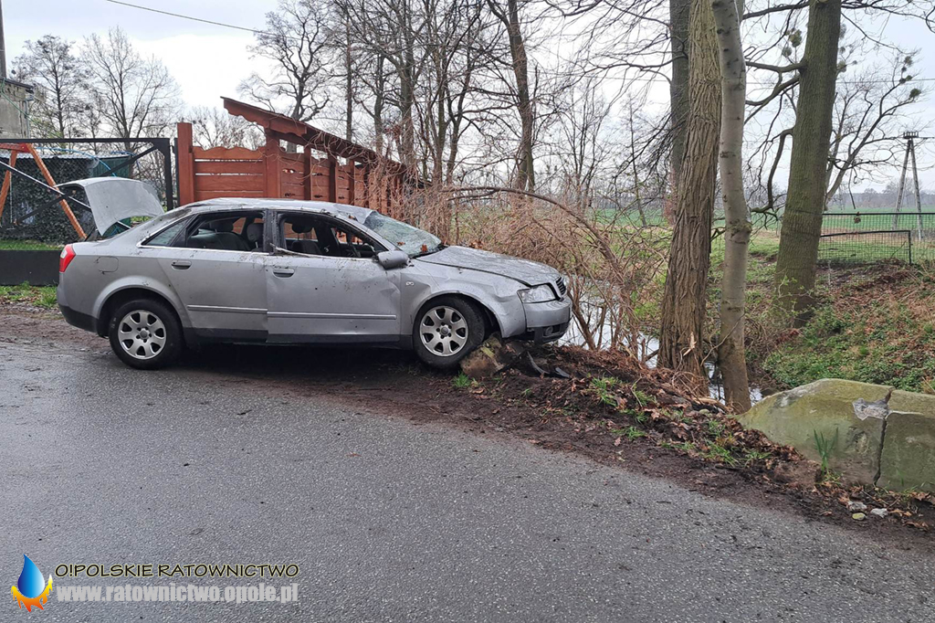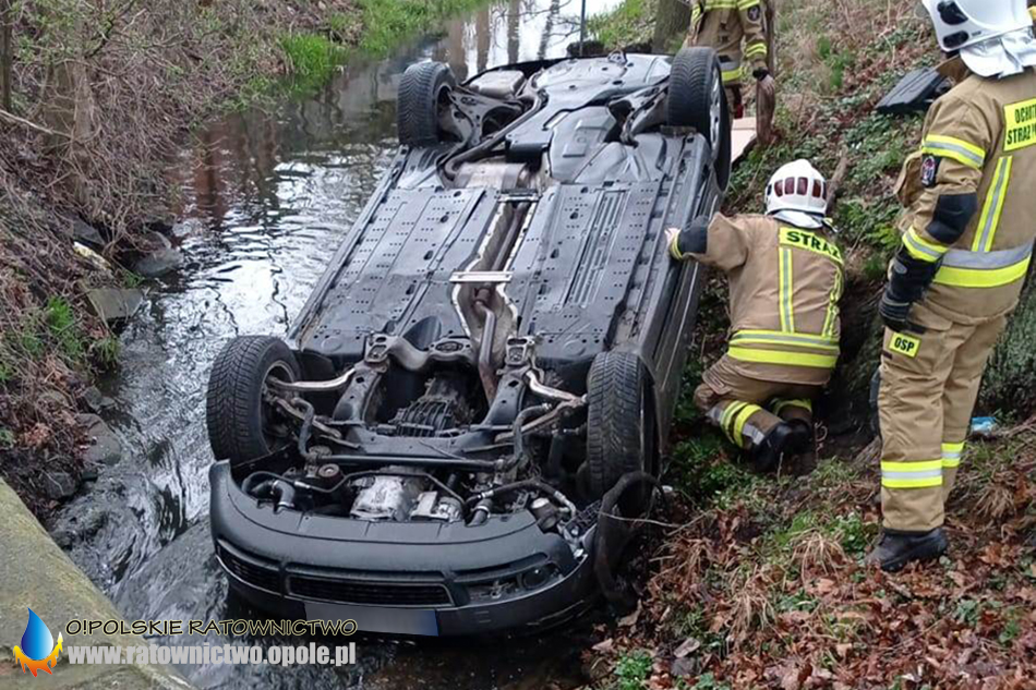 Kierujący Audi stracił panowanie nad pojazdem, uderzył w betonowy mur i auto wpadło do Potoku Prószkowskiego.