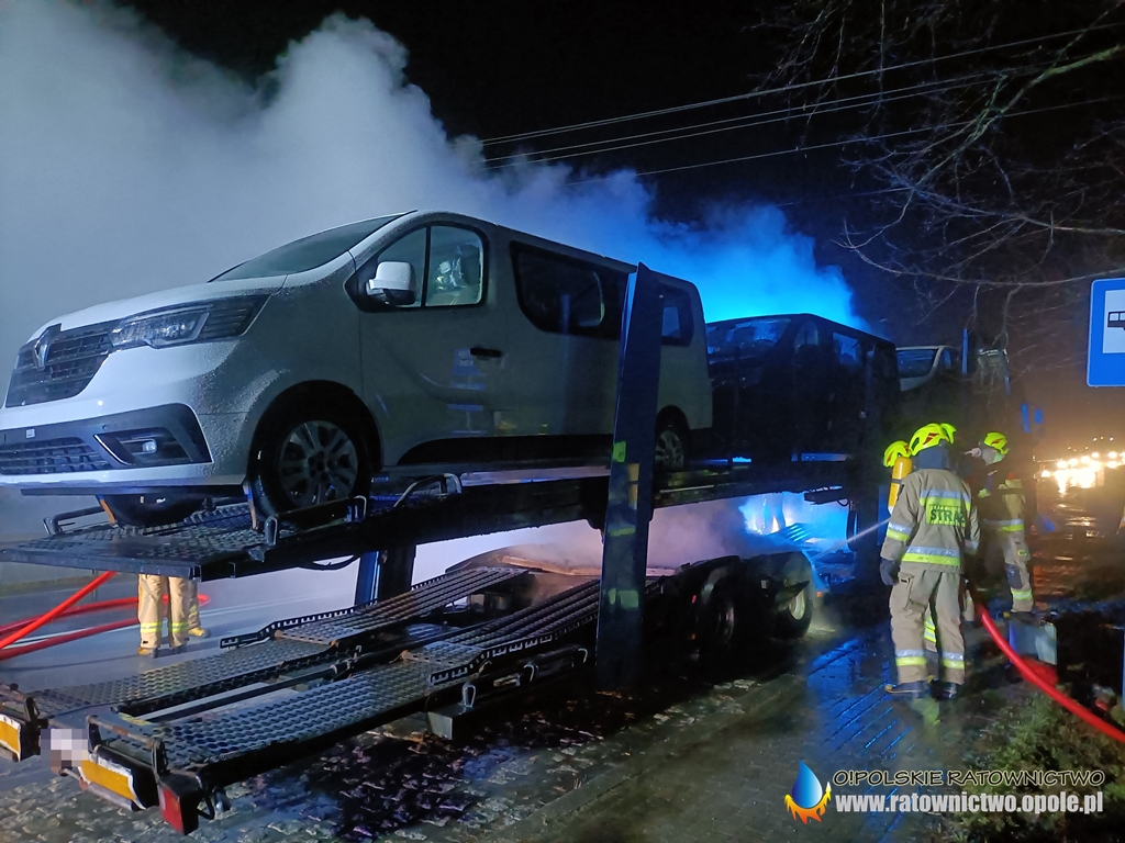 Działania strażaków polegały na podaniu dwóch prądów wody, w natarciu i obronie. Dzięki sprawnym działaniom ogień nie przedostał się na przewożone samochody.