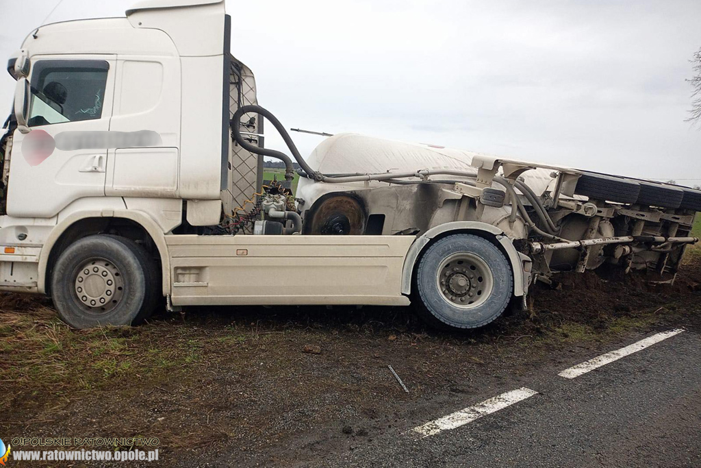 Na szczęście kierującemu nic się nie stało. Strażacy sprawdzili także, czy nie ma wycieku z uszkodzonej ciężarówki.