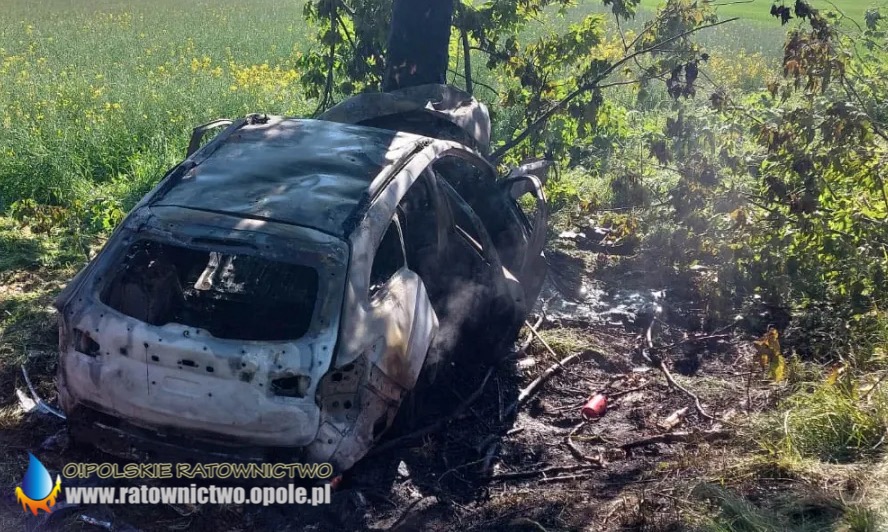 W wyniku zderzenia samochodu z drzewem, pojazd zapalił się. Kierowca spłonął wewnątrz osobówki. Mężczyzna poniósł śmierć na miejscu.