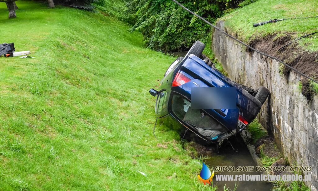 Po dojeździe na miejsce potwierdzono dachowanie samochodu osobowego, które zakończyło się w przydrożnej rzeczce. Pojazdem podróżował jedynie 22-letni kierujący.