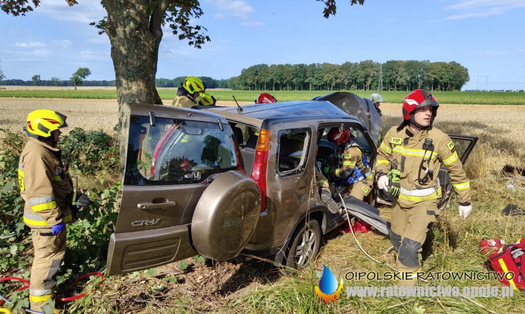 „Samochód osobowy w którym podróżowały 2 osoby z nieznanych przyczyn zjechał z drogi i uderzył w drzewo, jedna osoba nieprzytomna została uwięziona w samochodzie.” – informuje kpt. Karol Grzyb oficer prasowy Komendanta Powiatowego PSP w Kluczborku.