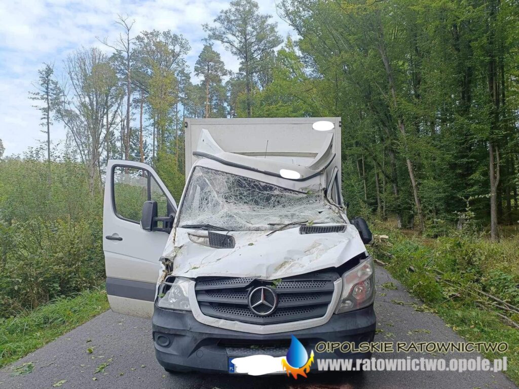 Po dojeździe na miejsce potwierdzono treść zgłoszenia. Przydrożne drzewo spadło na jadący samochód dostawczy marki Mercedes.