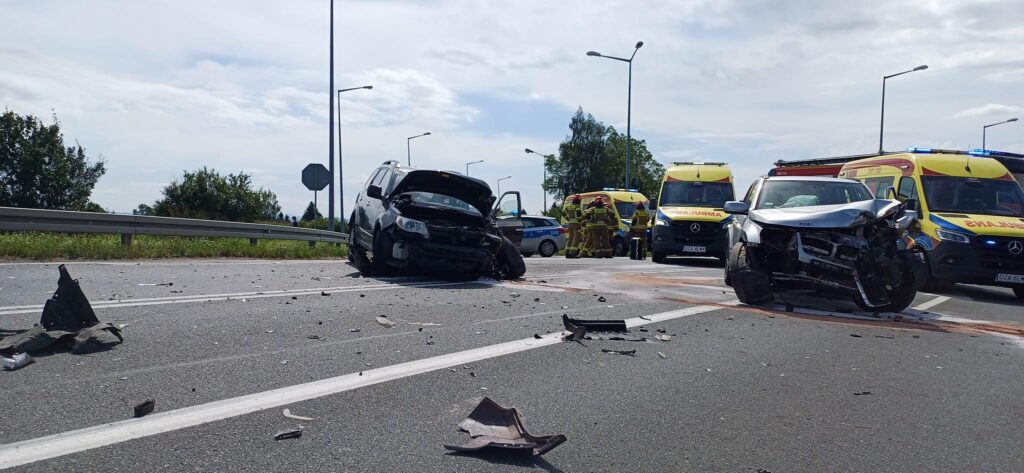 Doszło do zderzenia czołowego dwóch samochodów osobowych – Suzuki i Subaru. Pojazdami podróżowało łącznie 6 osób. W wyniku zderzenia wszyscy podróżujący zostali poszkodowani.