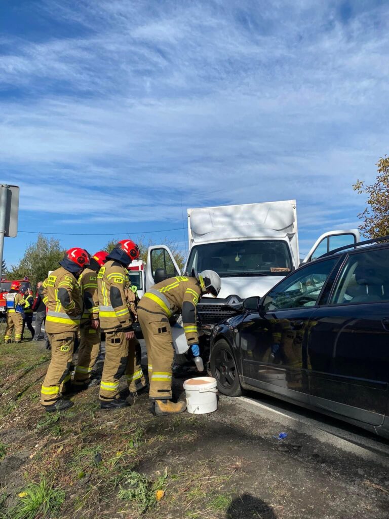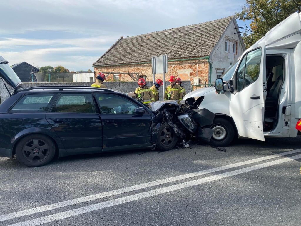 Doszło do zderzenia czołowego dwóch pojazdów – samochodu osobowego i samochodu dostawczego.