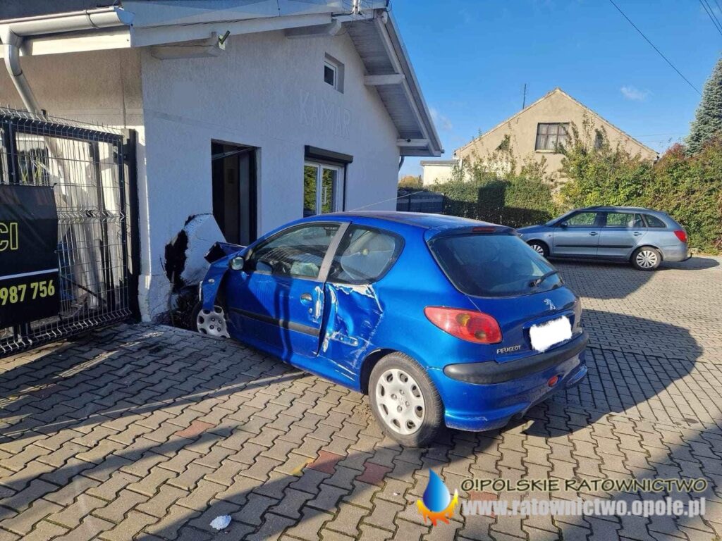 Po dojeździe na miejsce zastano samochód osobowy marki Peugeot wbity w jeden z przydrożnych budynków.