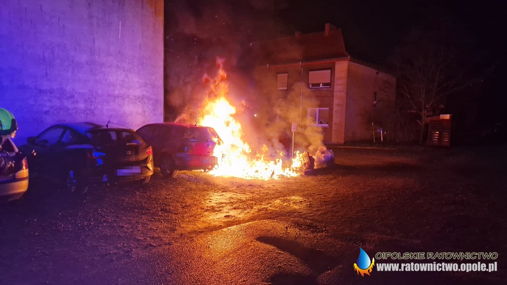 Po przybyciu na miejsce strażacy zastali palące się plastikowe kontenery na śmieci i samochód osobowy.