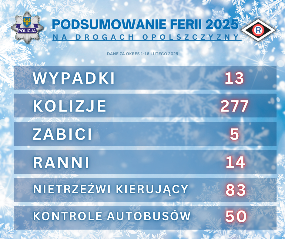 W okresie ferii zimowych, od 1 do 16 lutego, na drogach Opolszczyzny doszło do 13 wypadków, w których zginęło 5 osób, a 14 zostało rannych. Ponadto odnotowano 227 kolizji, a funkcjonariusze zatrzymali 83 nietrzeźwych kierujących, którzy stanowili poważne zagrożenie dla innych uczestników ruchu. Nie zabrakło także kontroli autobusów przewożących dzieci i młodzież na zimowy wypoczynek – skontrolowano 50 pojazdów, sprawdzając zarówno ich stan techniczny, jak i trzeźwość kierowców.