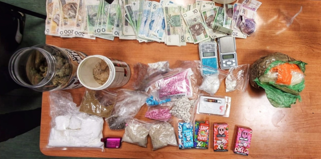 Ich podejrzenia potwierdziły się, kiedy w miejscu zamieszkania podejrzewanego zabezpieczyli kilogram różnych narkotyków. Podczas przeszukania śledczy znaleźli kokainę, amfetaminę, marihuanę, haszysz oraz tabletki MDMA oraz 2C-B. Zabezpieczyli również 5 e-papierosów zawierających THC.