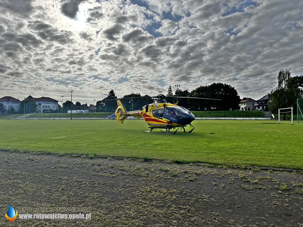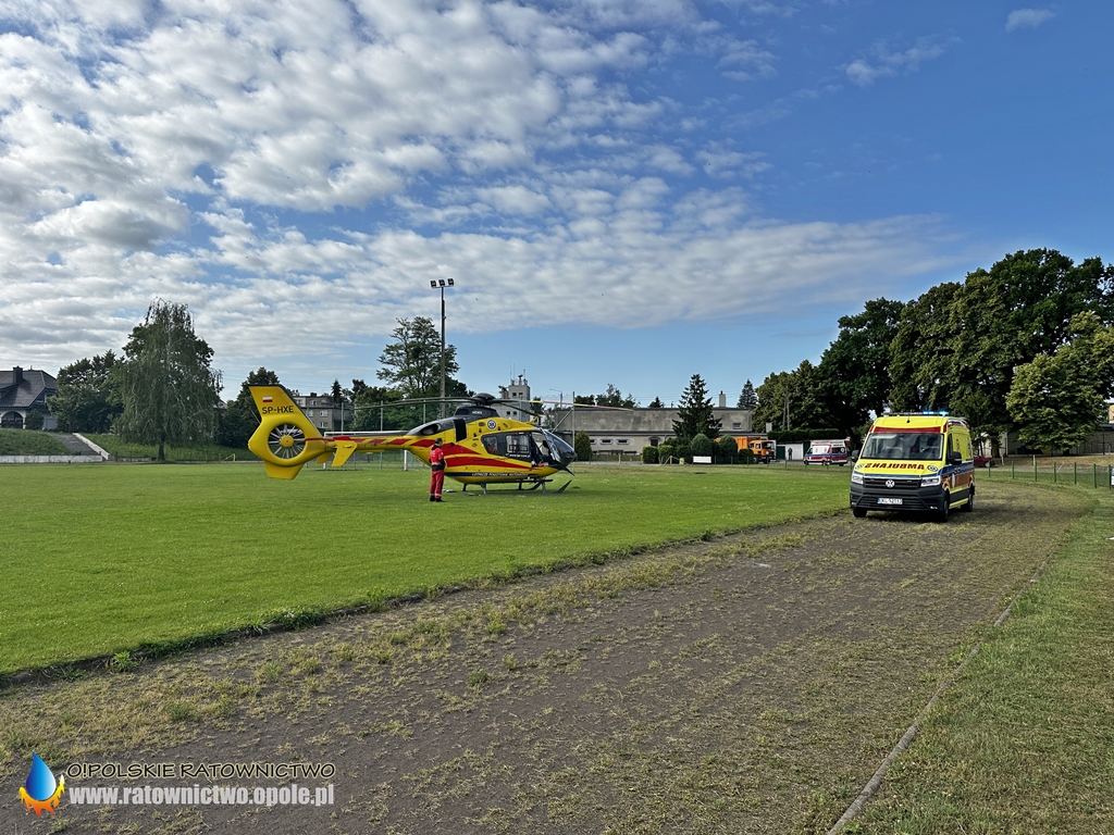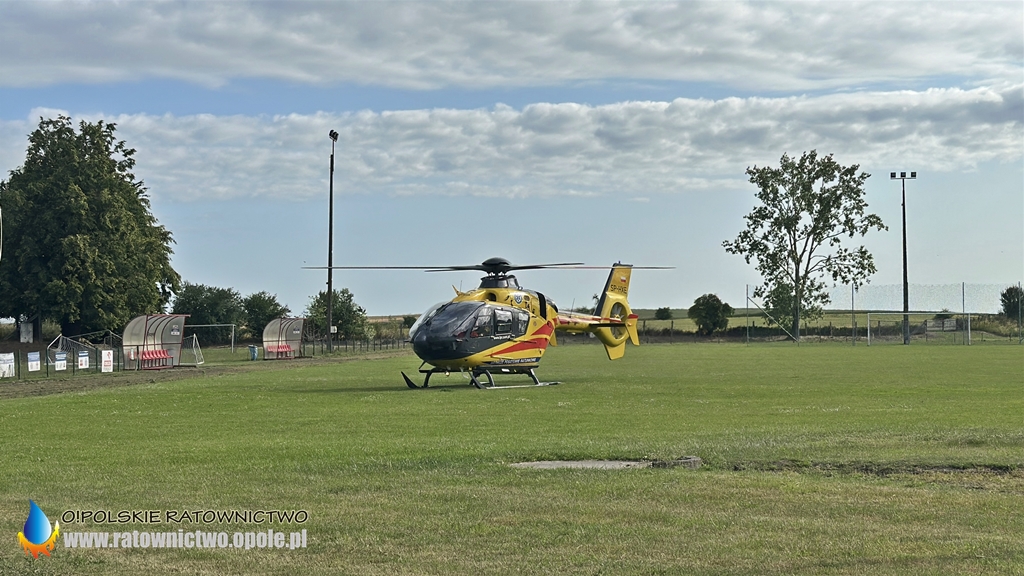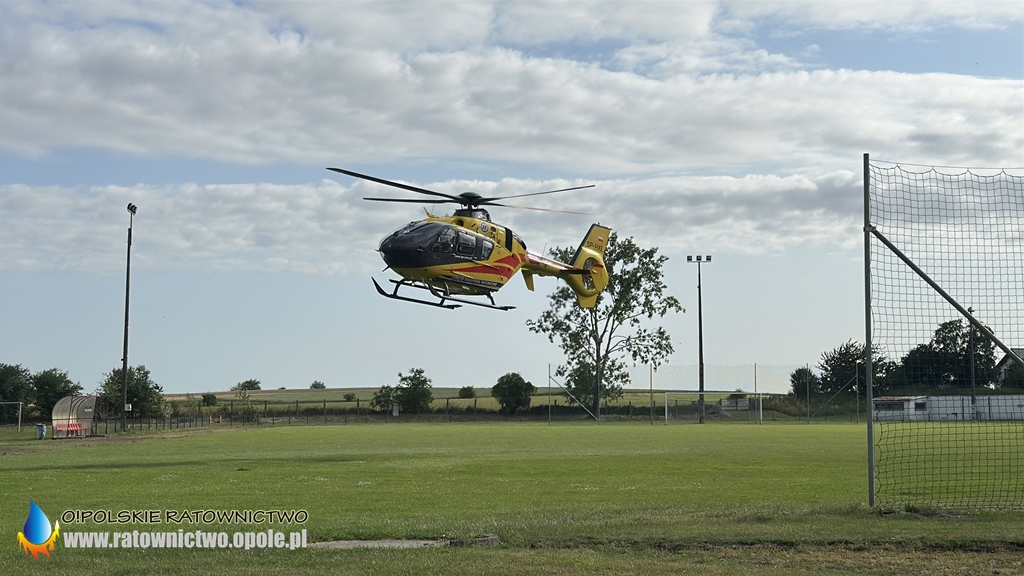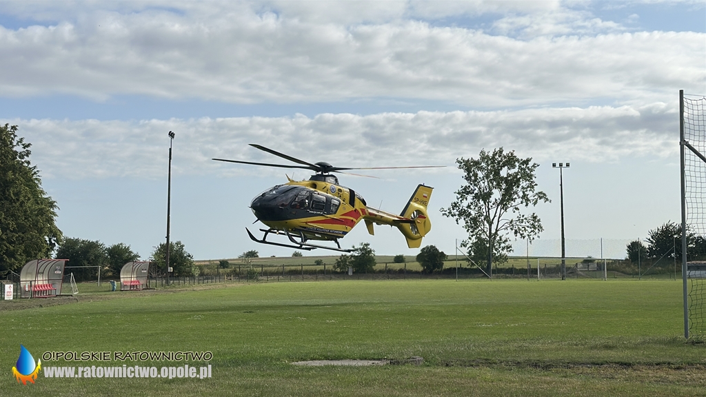 Mężczyzna z obrażeniami ciała został zabrany przez ZRM na stadion miejski w Byczynie skąd do szpitala został przetransportowany przez śmigłowiec LPR..