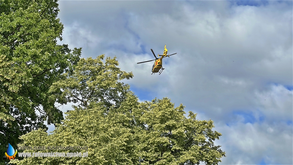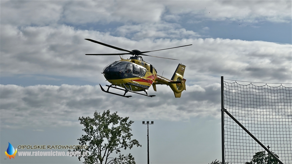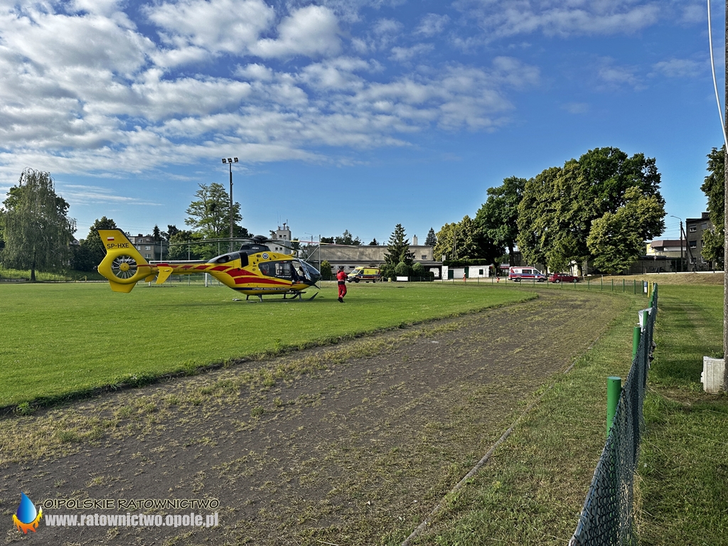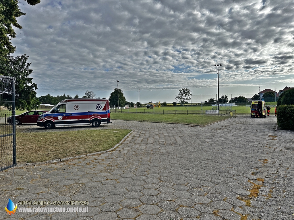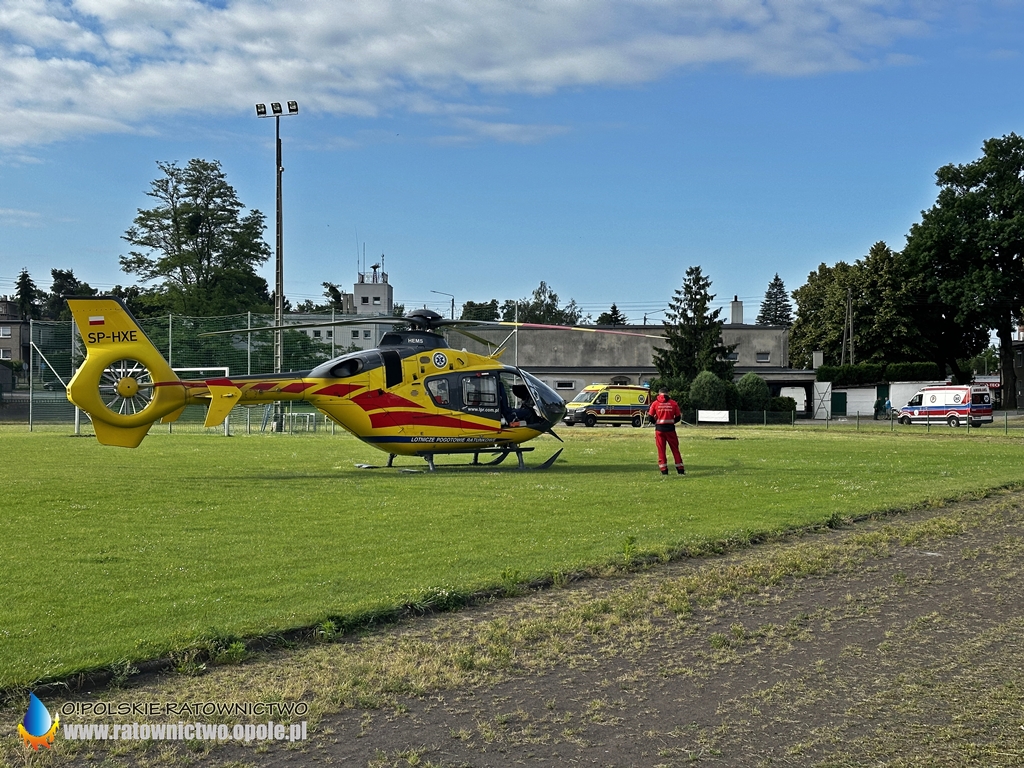 Mężczyzna z obrażeniami ciała został zabrany przez ZRM na stadion miejski w Byczynie skąd do szpitala został przetransportowany przez śmigłowiec LPR..