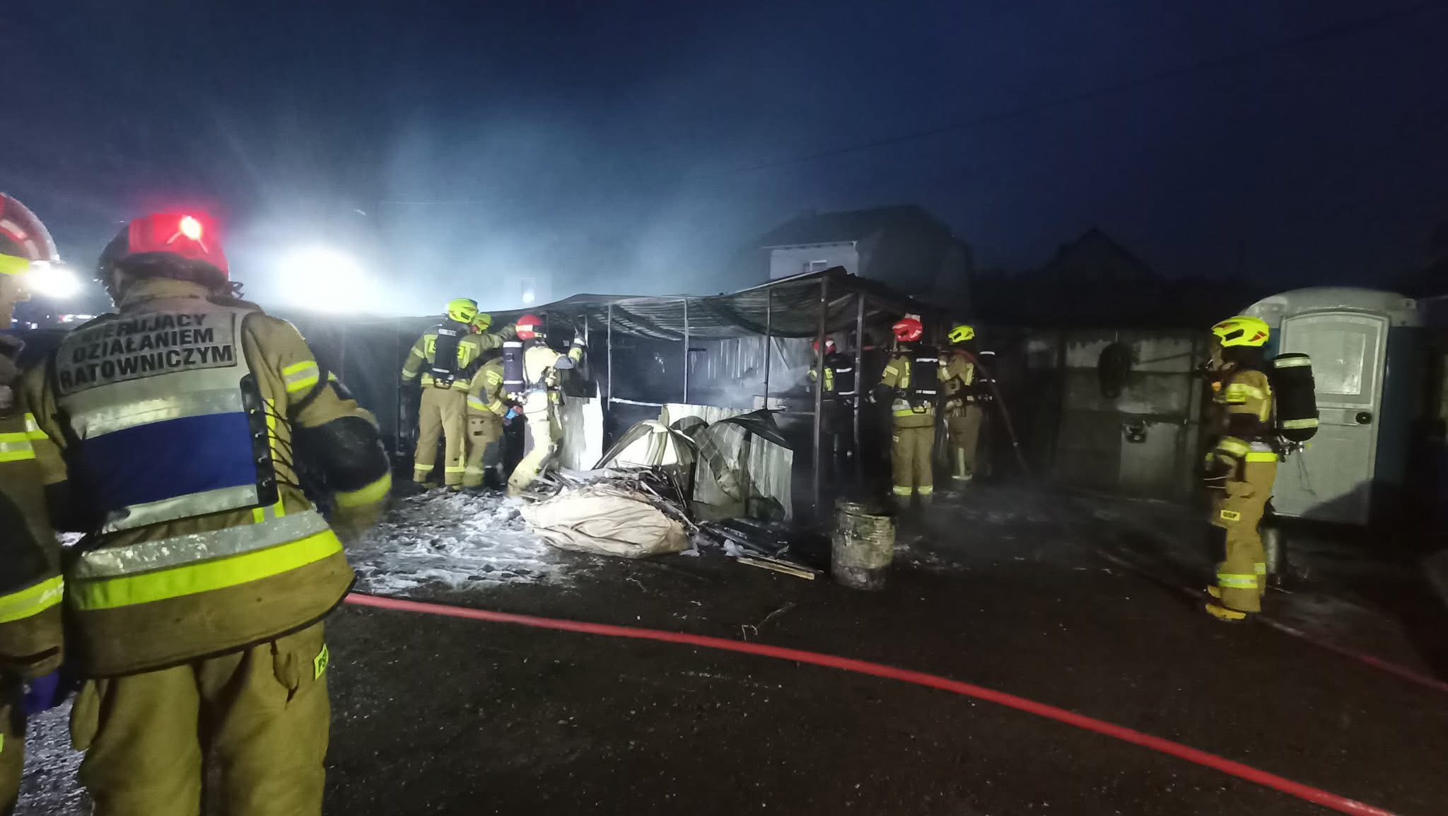 Po dojeździe pierwszych sił stwierdzono rozwinięty pożar trzech blaszanych garaży znajdujących się na terenie zakładu. Występowało silne zadymienie oraz widoczne płomienie. Strażacy przystąpili do gaszenia ognia oraz zabezpieczenia terenu.
