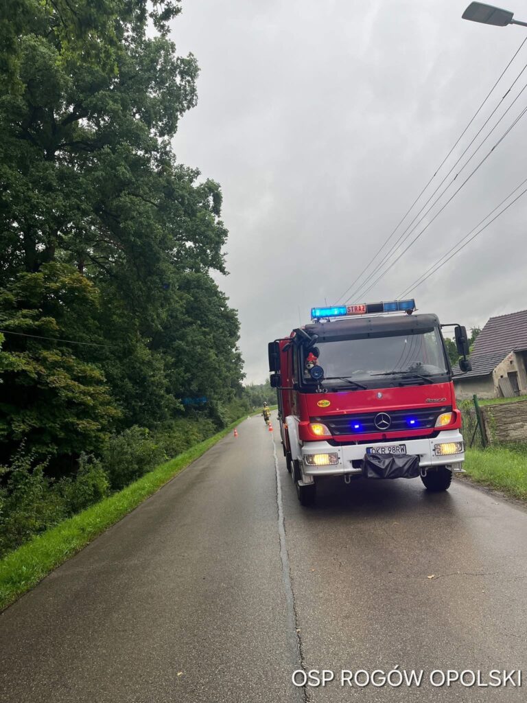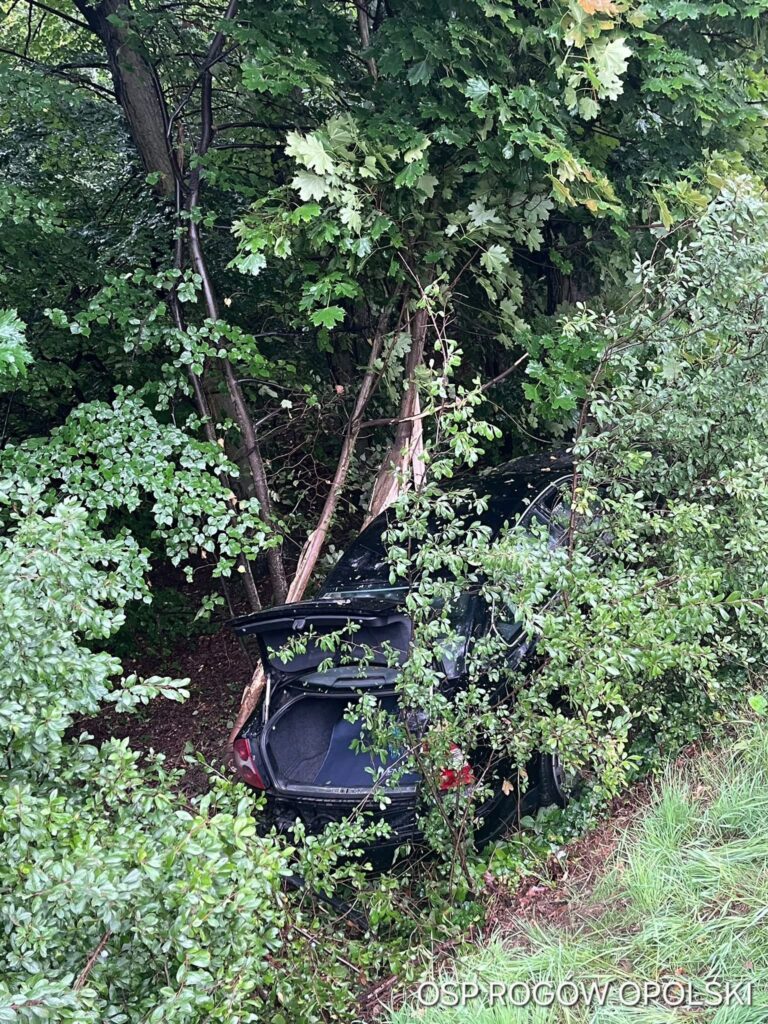 Pojazd wypadł z jezdni i zatrzymał się w lesie. Na miejscu interweniowały zastępy z OSP Rogów Opolski oraz JRG Krapkowice. Samochodem podróżowała jedna osoba, która nie odniosła obrażeń.