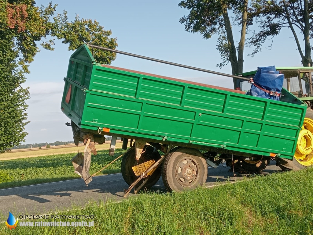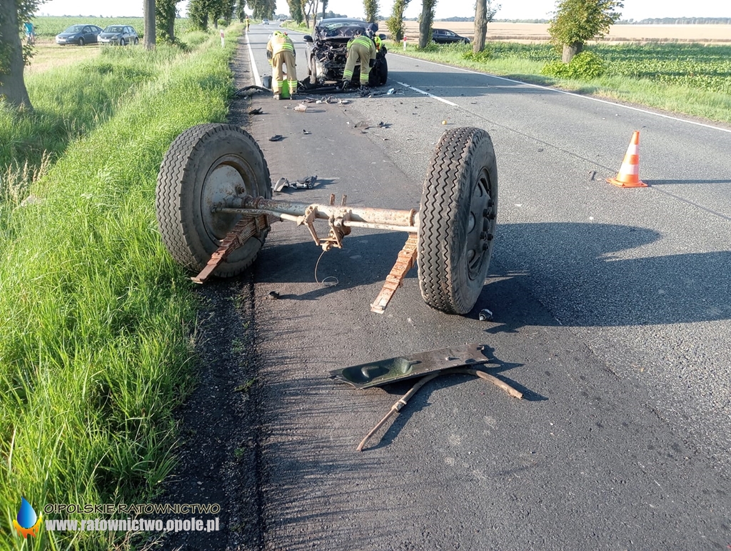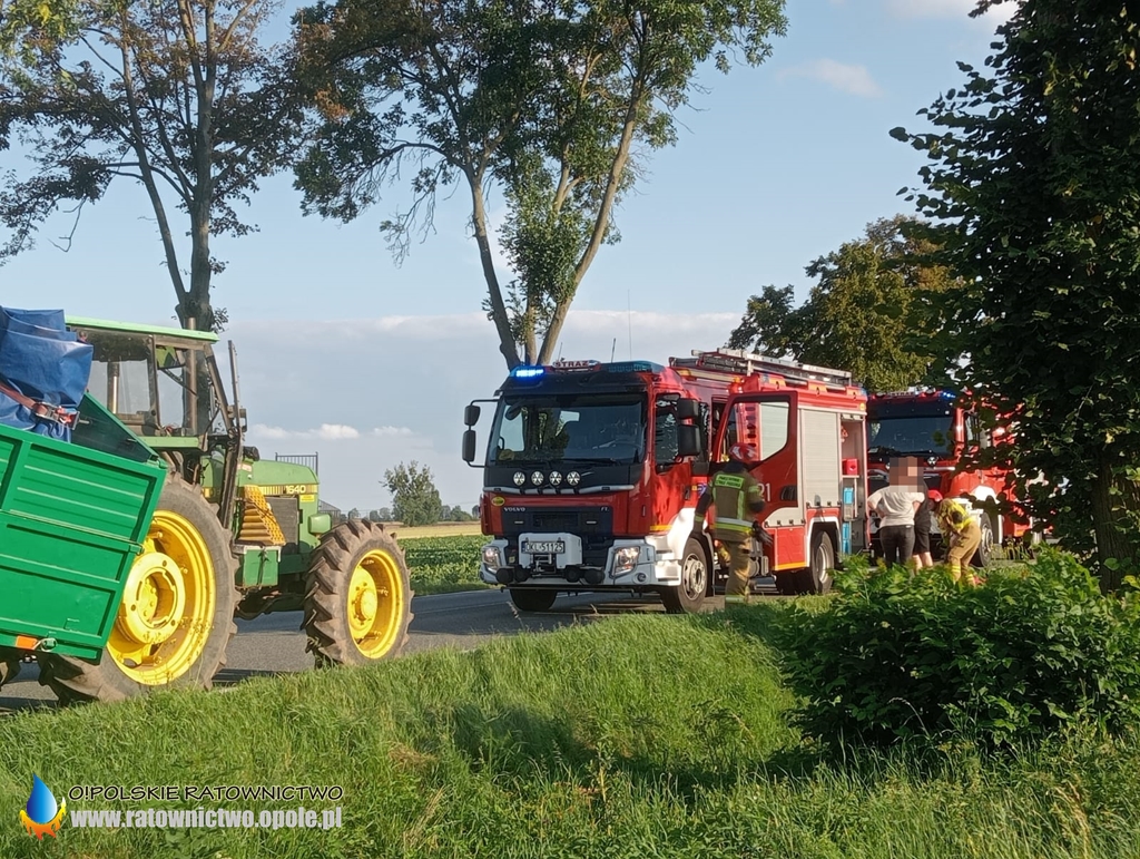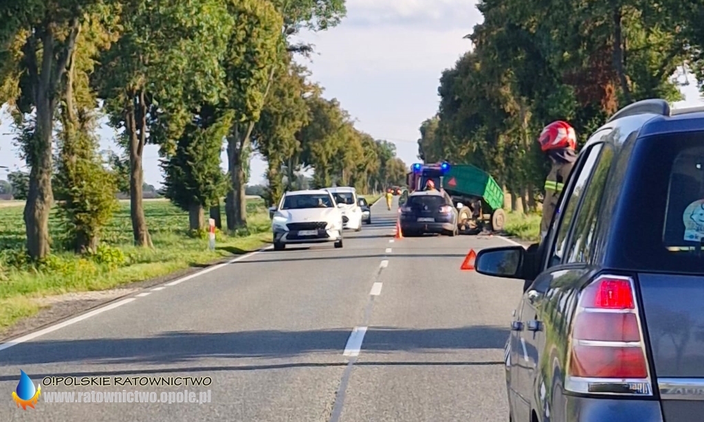 Kierujący samochodem osobowym marki Renault, jadąc w kierunku Kluczborka, z nieznanych przyczyn uderzył w tył przyczepy ciągnika rolniczego.