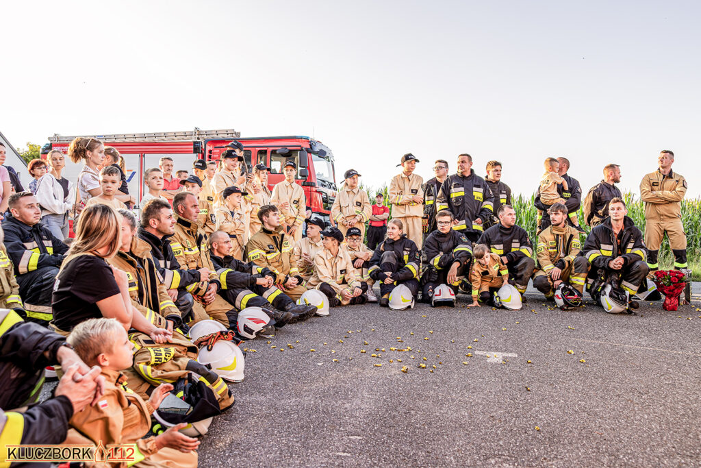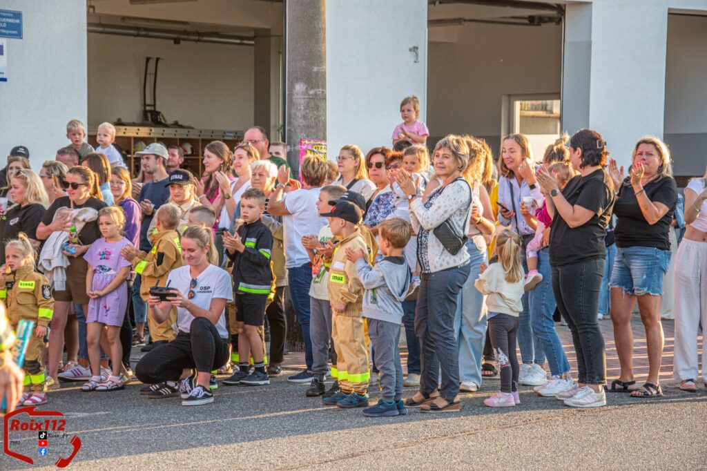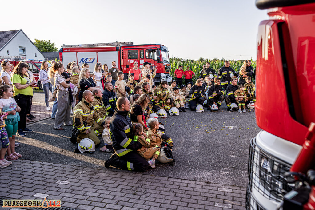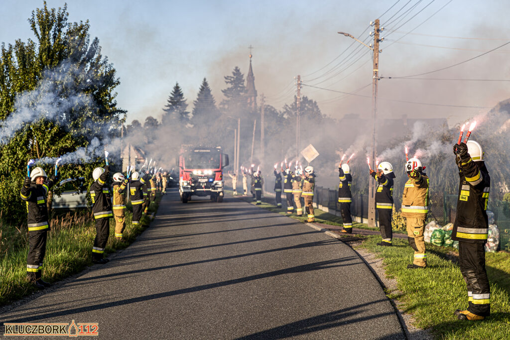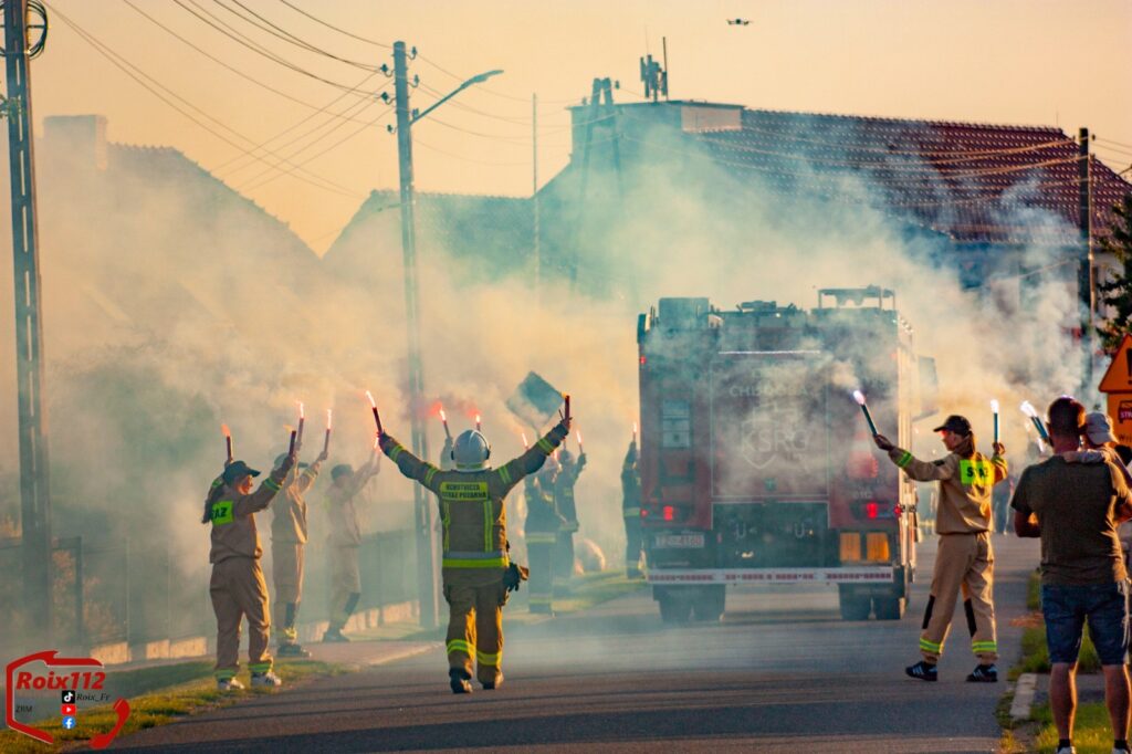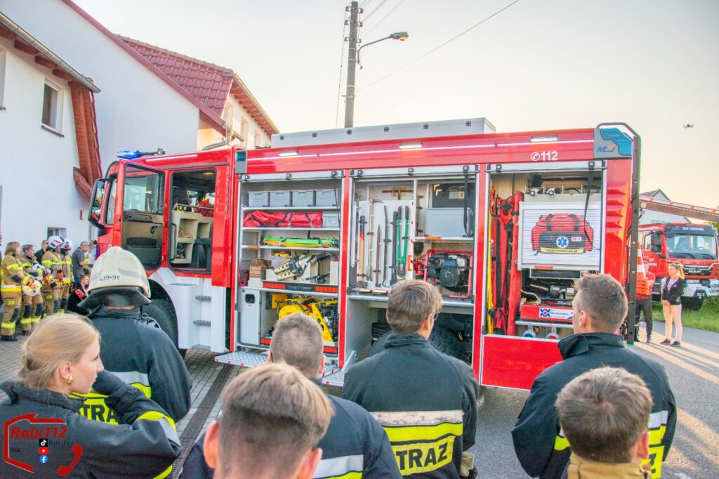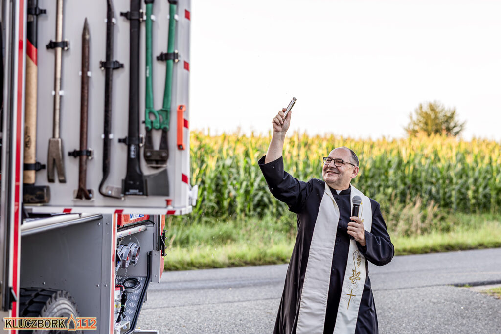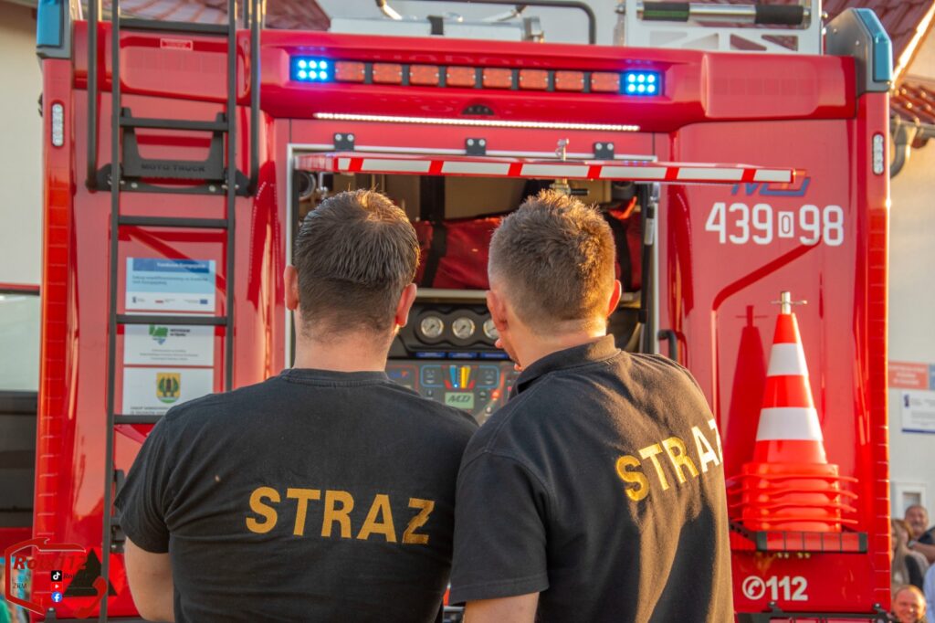 Podczas uroczystości druhowie ustawili się w szpaler, a w momencie wjazdu pojazdu na plac jednostki odpalili race, tworząc efektowne i symboliczne powitanie nowego wozu.