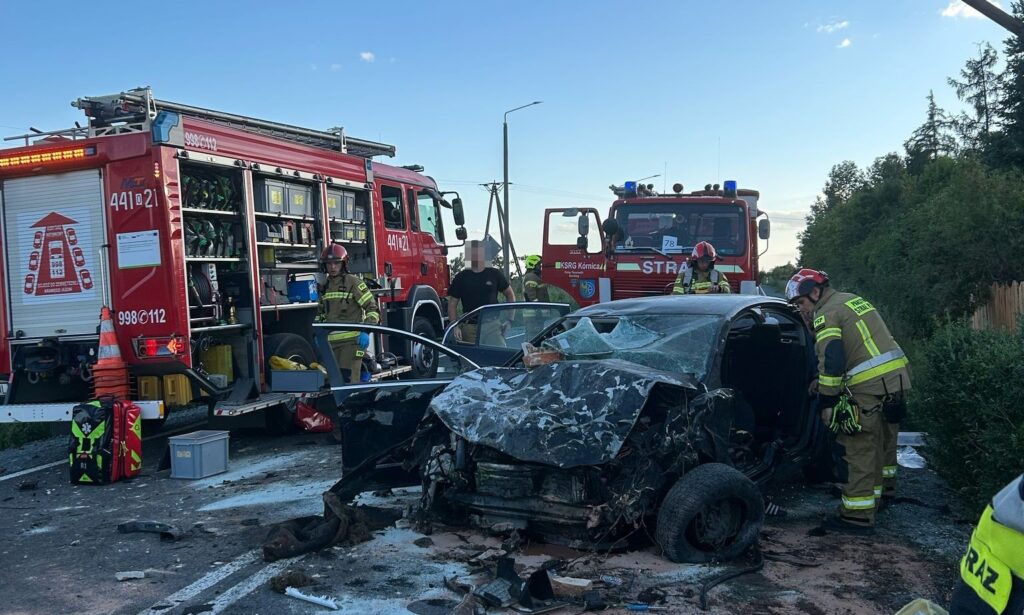 Po przybyciu służb ratunkowych na miejsce zdarzenia okazało się, że kierujący samochodem osobowym marki Volkswagen z nieustalonych dotąd przyczyn zjechał na przeciwny pas ruchu, gdzie zderzył się z BMW, a następnie uderzył w ścianę budynku mieszkalnego.